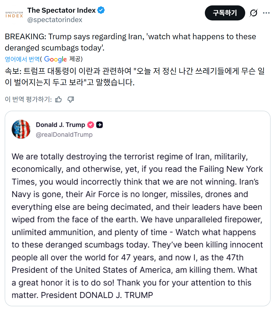 [정치]오늘자 이란을 향한 트럼프 트루스소셜 워딩 작성자서스날|작성시간26.03.13|조회수4,458 목록 댓글 2 글자크기 작게가 글자크기 크게가 these deranged scumbags (이 미친 쓰레기들) *순화함 다음검색 현재 게시글 추가 기능 열기 북마크 공유하기 신고 센터로 신고 댓글 댓글 2 댓글쓰기 답글쓰기 댓글 리스트 작성자개밥 | 작성시간 26.03.13 3조쓸라고? 작성자Deloitte | 작성시간 26.03.13 자기소개 댓글 전체보기