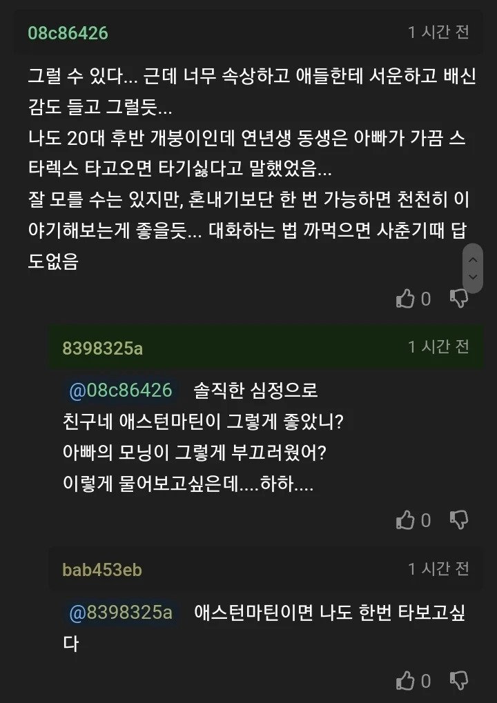 비 많이 와서 애들 픽업하러 갔는데 무시당했다... 작성자러바오|작성시간26.03.15|조회수10,389 목록 댓글 17 글자크기 작게가 글자크기 크게가 다음검색 현재 게시글 추가 기능 열기 북마크 공유하기 신고 센터로 신고 댓글 댓글 17 댓글쓰기 답글쓰기 댓글 리스트 작성자Ralph Lauren | 작성시간 26.03.15 저도 한번 타보고 싶네요 애스턴마틴.. 작성자아메리카노 | 작성시간 26.03.15 애스턴마틴 진짜 개띵차임 답댓글 작성자귄터 슈타이너 | 작성시간 26.03.15 그런데 F1레이스카는 왜 그모냥인가요.... 작성자WONYOUNG | 작성시간 26.03.15 드라이버가 알론소 ㄷㄷ 작성자께께오톡 | 작성시간 26.03.16 아빠도 학교근처에 주차하고 태워달라했어야지 댓글 전체보기