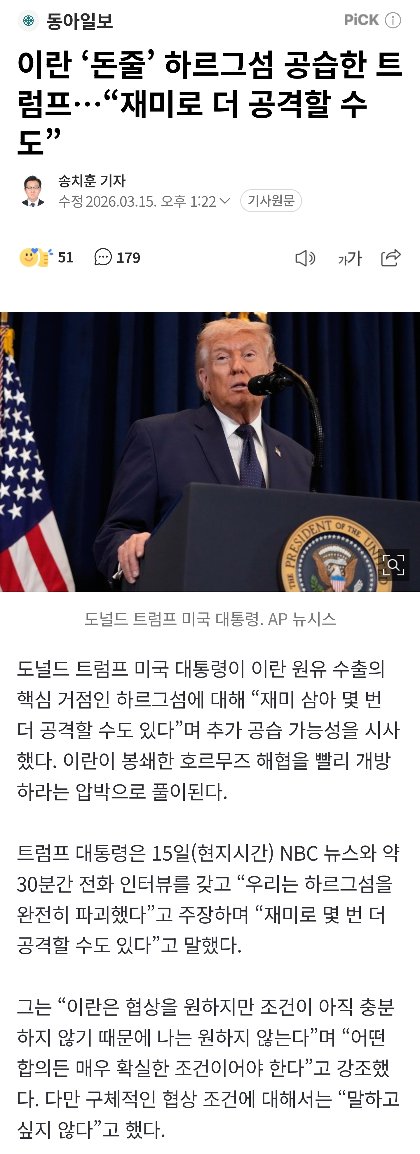 [기사]이란 ‘돈줄’ 하르그섬 공습한 트럼프…“재미로 더 공격할 수도” 작성자Madrid|작성시간26.03.15|조회수3,520 목록 댓글 14 글자크기 작게가 글자크기 크게가 https://n.news.naver.com/article/020/0003704083이란 ‘돈줄’ 하르그섬 공습한 트럼프…“재미로 더 공격할 수도”도널드 트럼프 미국 대통령이 이란 원유 수출의 핵심 거점인 하르그섬에 대해 “재미 삼아 몇 번 더 공격할 수도 있다”며 추가 공습 가능성을 시사했다. 이란이 봉쇄한 호르무즈 해협을 빨리 n.news.naver.com전쟁으로 just for fun 드립 치는 미국 대통령 다음검색 현재 게시글 추가 기능 열기 북마크 공유하기 신고 센터로 신고 댓글 댓글 14 댓글쓰기 답글쓰기 댓글 리스트 작성자슈팅라이크종수 | 작성시간 26.03.15 트럼프는 그때 죽었어야 했나.. 작성자농구인 | 작성시간 26.03.15 재미? 미쳤나 작성자화려한조명 | 작성시간 26.03.15 이런 천박한 지도자는 그만 보고 싶다 작성자음악대학 | 작성시간 26.03.15 노망난 나르시스트 작성자I’d rather be ashes than dust | 작성시간 26.03.15 저 미치광이랑 일족을 멸족시켜야함 진짜 댓글 전체보기