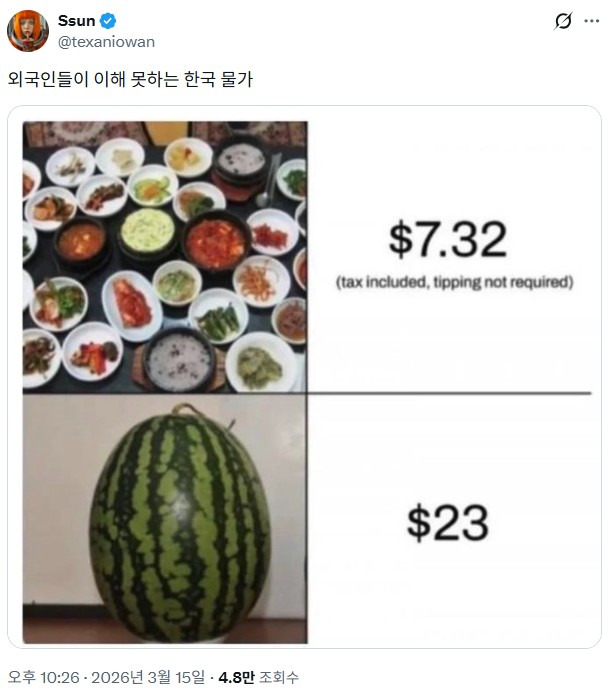 [기타]외국인들이 이해 못 하는 한국 물가 작성자blurred|작성시간26.03.16|조회수3,471 목록 댓글 3 글자크기 작게가 글자크기 크게가 다음검색 현재 게시글 추가 기능 열기 북마크 공유하기 신고 센터로 신고 댓글 댓글 3 댓글쓰기 답글쓰기 댓글 리스트 작성자Noel Gallagher | 작성시간 26.03.16 이제는 7불도 찾기 힘들어~ 작성자Vicario | 작성시간 26.03.16 두쫀쿠 두개 9$~ 작성자이통사삼사 | 작성시간 26.03.16 얼추 맞을듯 환율 개비싸서 댓글 전체보기
