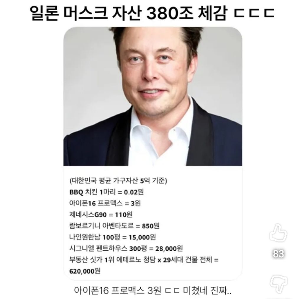 일론 머스크 자산 380조 체감 하기 ㄷㄷㄷ 작성자Christian Convery|작성시간26.03.22|조회수16,669 목록 댓글 5 글자크기 작게가 글자크기 크게가 다음검색 현재 게시글 추가 기능 열기 북마크 공유하기 신고 센터로 신고 댓글 댓글 5 댓글쓰기 답글쓰기 댓글 리스트 작성자밀키스 | 작성시간 26.03.22 형님 치킨한마리만요 작성자프랭크 램파드 | 작성시간 26.03.22 형님 에테르노는 바라지도 않을테니 28000원만 투자해서 시그니엘만 좀.. 작성자대발형님 | 작성시간 26.03.22 점심먹고 커피 한 잔 마신게 나인원 한남이네 작성자시릴라 | 작성시간 26.03.22 현실판 심즈 가능하겠네 작성자임중용 | 작성시간 26.03.22 0.01퍼만.. 댓글 전체보기