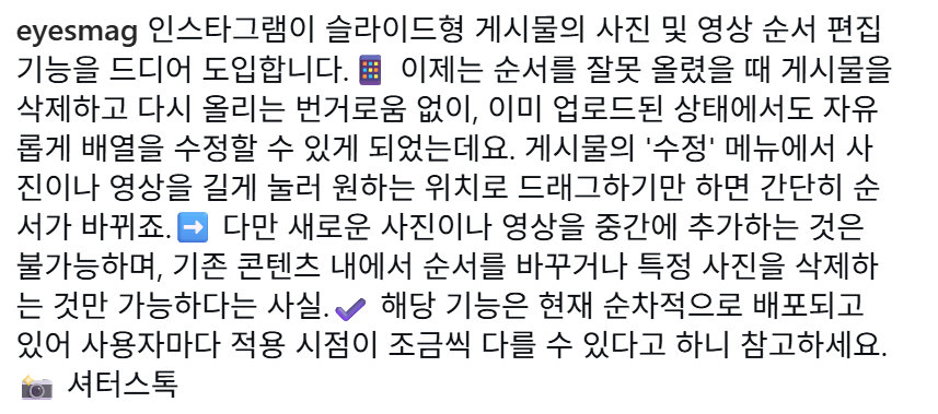 樂soccer [기타]인스타그램, 사진 순서 변경 가능해진다 작성시간26.03.24|조회수4,505 목록 댓글 4 글자크기 작게가 글자크기 크게가 다음검색 현재 게시글 추가 기능 열기 북마크 공유하기 신고 센터로 신고 댓글 4 댓글 리스트 작성시간 26.03.24 해쉬태그 5개 이거 수정좀해줫으몀 ㅜㅜ 답댓글 작성시간 26.03.24 제발 ㅠㅠㅠㅠ 작성시간 26.03.24 안삽니다 작성시간 26.03.24 피드가 의미없어지니 이제 바꿔주냐... 카페 방문해 더 많은 댓글 만나기!