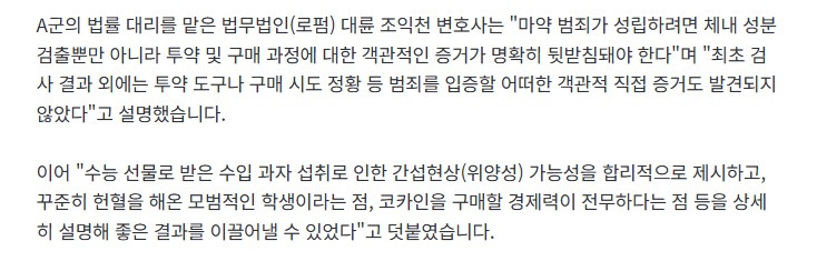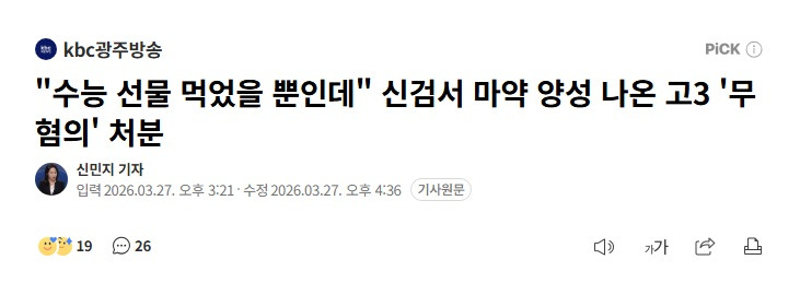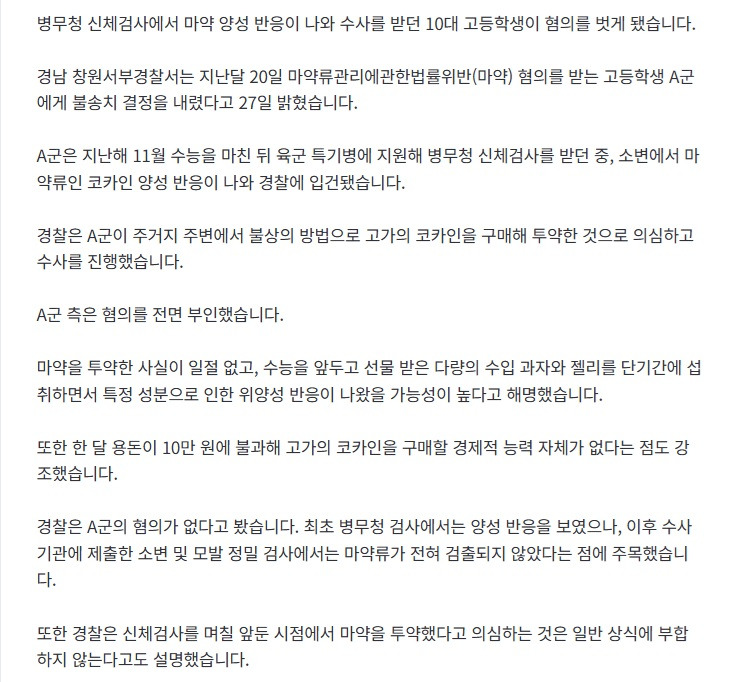 [기사]"수능 선물 먹었을 뿐인데" 신검서 마약 양성 나온 고3 '무혐의' 처분 작성자음교수|작성시간26.03.28|조회수1,056 목록 댓글 3 글자크기 작게가 글자크기 크게가 https://n.news.naver.com/mnews/article/660/0000106162?sid=102"수능 선물 먹었을 뿐인데" 신검서 마약 양성 나온 고3 '무혐의' 처분병무청 신체검사에서 마약 양성 반응이 나와 수사를 받던 10대 고등학생이 혐의를 벗게 됐습니다. 경남 창원서부경찰서는 지난달 20일 마약류관리에관한법률위반(마약) 혐의를 받는 고등학생 An.news.naver.com 다음검색 현재 게시글 추가 기능 열기 북마크 공유하기 신고 센터로 신고 댓글 댓글 3 댓글쓰기 답글쓰기 댓글 리스트 작성자광배근 | 작성시간 26.03.28 ㅋㅋㅋ 신검받으러 가기 며칠전에 마약을? 작성자고두심 | 작성시간 26.03.28 그 대마젤리 같은거 먹은건가..? 작성자베니테즈 | 작성시간 26.03.28 수입과자가 의심스럽네요 댓글 전체보기