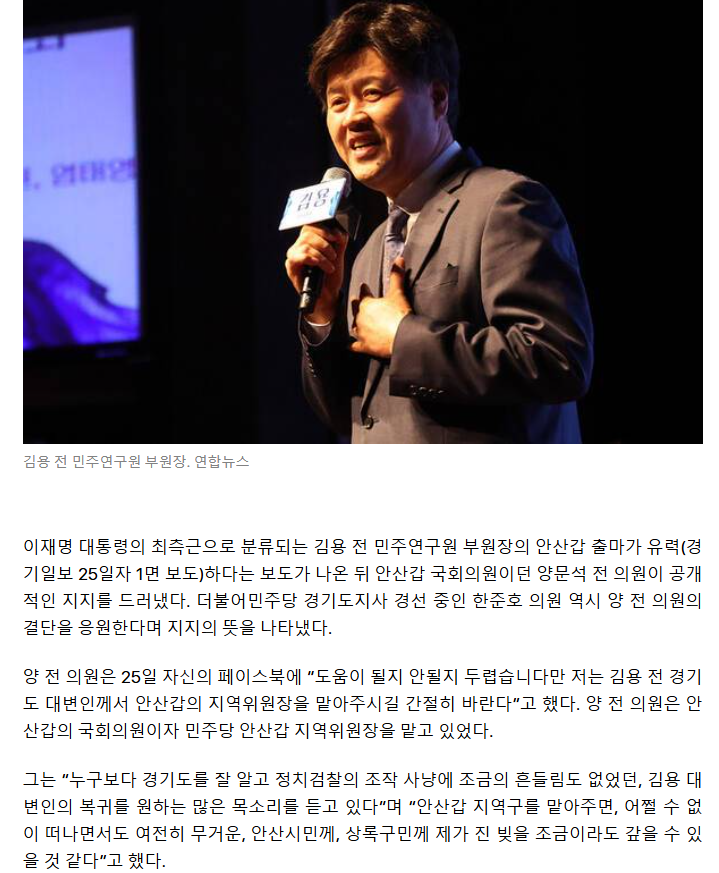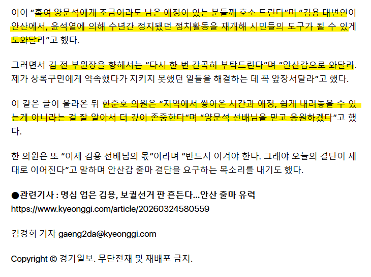 [정치]김용 안산갑 출마 유력 보도에 양문석 "안산갑 와달라"·한준호 "결단 응원" 작성자꼬부기|작성시간26.03.28|조회수1,059 목록 댓글 11 글자크기 작게가 글자크기 크게가 https://v.daum.net/v/20260325100806123 다음검색 현재 게시글 추가 기능 열기 북마크 공유하기 신고 센터로 신고 댓글 댓글 11 댓글쓰기 답글쓰기 댓글 리스트 작성자러바오 | 작성시간 26.03.28 내지마라 그냥 작성자천지격동 | 작성시간 26.03.28 후보내지마라 여긴 작성자담시즌엔 우승하나 | 작성시간 26.03.28 뭐하냐 늬들 작성자닥털 | 작성시간 26.03.28 김용은 요즘 돌아가는거 보니 재판 뒤집어질듯 하던데 작성자I.B.I LUV | 작성시간 26.03.28 여긴 후보 내지말자..... 여타 다른 경쟁력 있는 다른 당 후보에게 힘 실어 주는 게... 댓글 전체보기