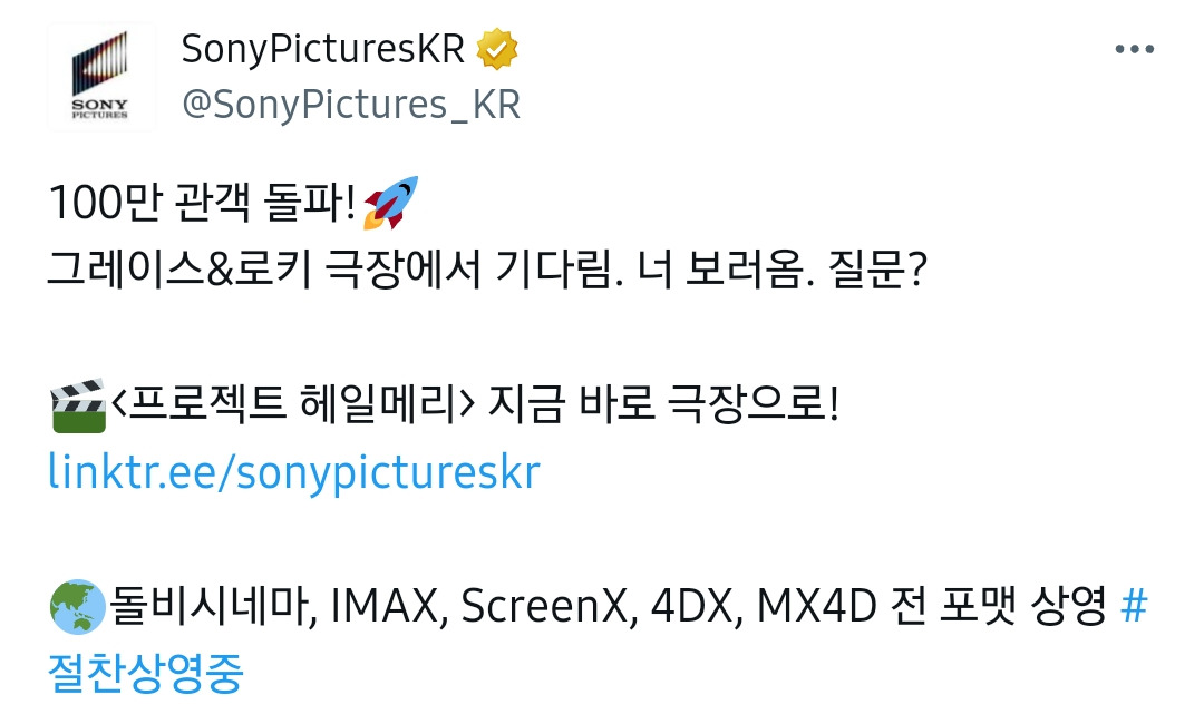 [영화]'프로젝트 헤일메리' 100만 관객 돌파 작성자서스날|작성시간26.03.28|조회수1,665 목록 댓글 26 글자크기 작게가 글자크기 크게가 다음검색 현재 게시글 추가 기능 열기 북마크 공유하기 신고 센터로 신고 댓글 댓글 26 댓글쓰기 답글쓰기 댓글 리스트 작성자Monica Bellucci | 작성시간 26.03.29 존잼 작성자깐징 | 작성시간 26.03.29 et이후로 최고의 지구인과 외계인의 우정 영화임 ㅋㅋㅋ 작성자오스카 아이작 | 작성시간 26.03.29 간만에 진짜 좋은 영화 봤네요 작성자마테우스 쿠냐 | 작성시간 26.03.29 한국인이 안좋아할 수가 없겠던데ㅋㅋㅋ 어려울까봐 안보는듯 작성자권오현 대구FC 입단 추진위원회 | 작성시간 26.03.29 더 흥행 원함 댓글 전체보기
