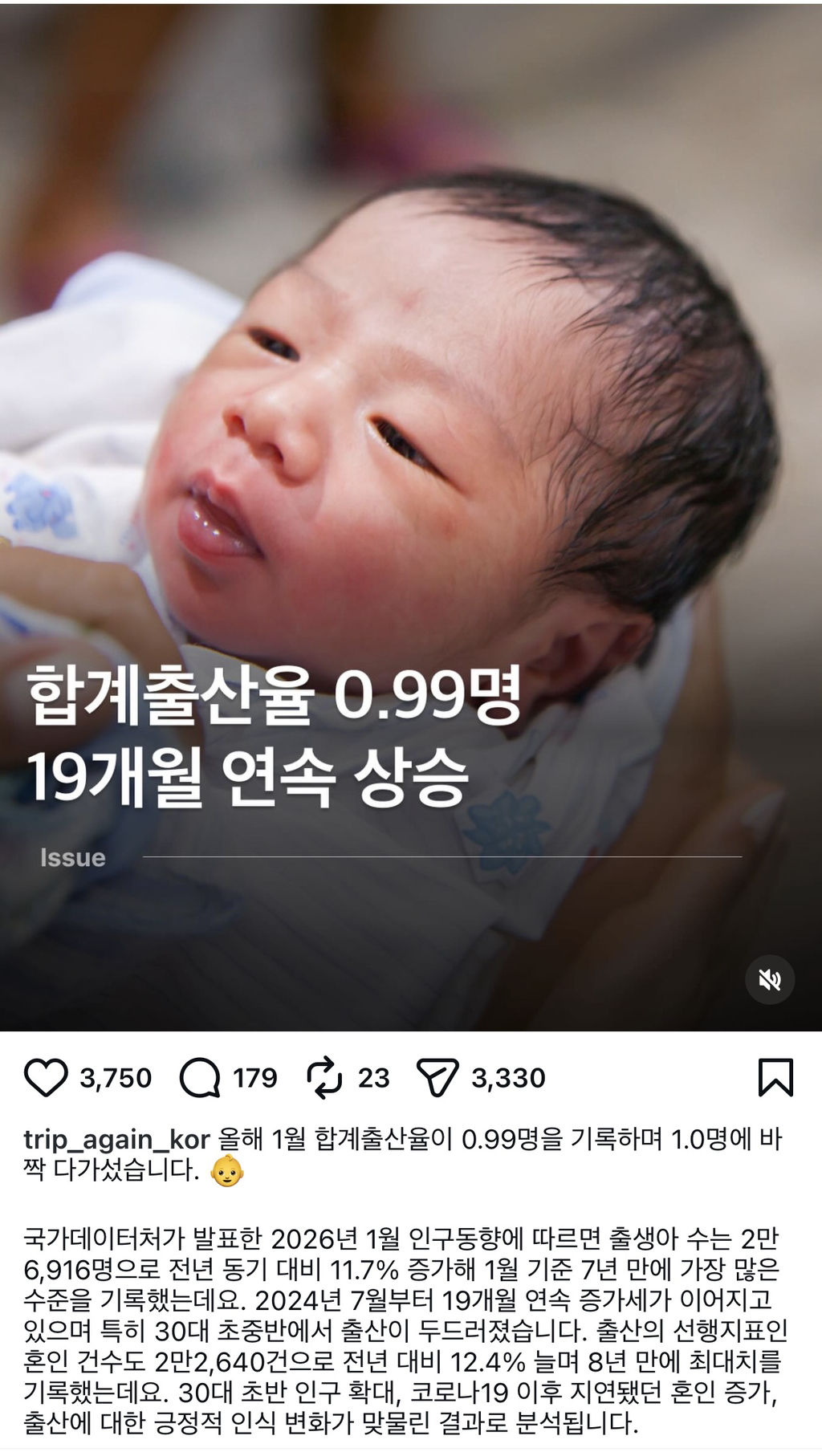 [정보]2026년 1월 대한민국 출산율 작성자I’d rather be ashes than dust|작성시간26.03.29|조회수1,137 목록 댓글 4 글자크기 작게가 글자크기 크게가 다음검색 현재 게시글 추가 기능 열기 북마크 공유하기 신고 센터로 신고 댓글 댓글 4 댓글쓰기 답글쓰기 댓글 리스트 작성자임중용 | 작성시간 26.03.29 아이들이 희망이다. 맘 놓고 아이들 낳을 수 있는 세상을 만들어줘라.. 작성자Mcaddress | 작성시간 26.03.29 낳는 것에 대한 지원도 중요하지만 키우는데 필요한 지원도 엄청 필요한듯 싶어요 작성자난몰러유 | 작성시간 26.03.29 1월이 원래 많기는해서 올해 추이를 더 봐야할듯 작성자캐스커 | 작성시간 26.03.29 0.99 ㄷㄷㄷ 댓글 전체보기