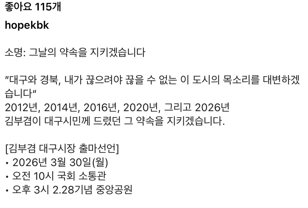 [정치]소명 : 그날의 약속을 지키겠습니다. 작성자록스 D 지벡|작성시간26.03.29|조회수967 목록 댓글 9 글자크기 작게가 글자크기 크게가 한번 해봅시더 다음검색 현재 게시글 추가 기능 열기 북마크 공유하기 신고 센터로 신고 댓글 댓글 9 댓글쓰기 답글쓰기 댓글 리스트 작성자둥그리 | 작성시간 26.03.29 결국 나오시는군요 작성자경찰청장 | 작성시간 26.03.29 수성갑 김부겸에서 대구시장 후보 김부겸으로 가보자고 작성자김밥먹고냠냠 | 작성시간 26.03.29 이러니 저러니 해도 험지에서 도전하는건 인정하고 응원해줘야함 작성자엑셀시오르 | 작성시간 26.03.29 아이고 ㅜㅜ 염치없지만 이번에도 부탁드립니다. 작성자이스카리온 | 작성시간 26.03.30 ㄷㄷㄷ 댓글 전체보기