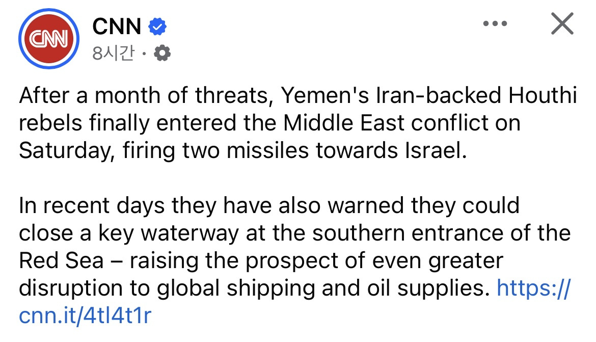 후티 반군, 이스라엘에 미사일 2발 발사하며 참전 작성자가을날4|작성시간26.03.30|조회수772 목록 댓글 4 글자크기 작게가 글자크기 크게가 홍해 폐쇄 할 수 있다며 협박 다음검색 현재 게시글 추가 기능 열기 북마크 공유하기 신고 센터로 신고 댓글 댓글 4 댓글쓰기 답글쓰기 댓글 리스트 작성자맨소래담 | 작성시간 26.03.30 다 몰락으로 가는건가? 작성자諦めない | 작성시간 26.03.30 헐 작성자헌신적인악마 | 작성시간 26.03.30 그만하자 ㅠㅠ 작성자프랭크 램파드 | 작성시간 26.03.30 아 개조지네 댓글 전체보기