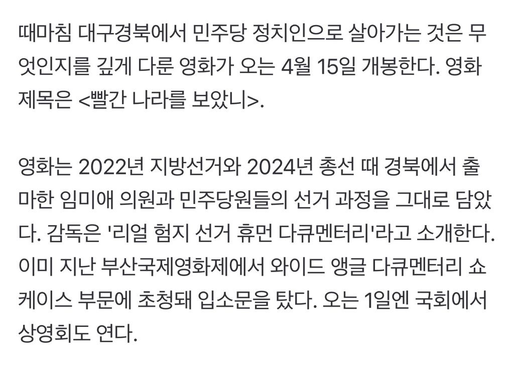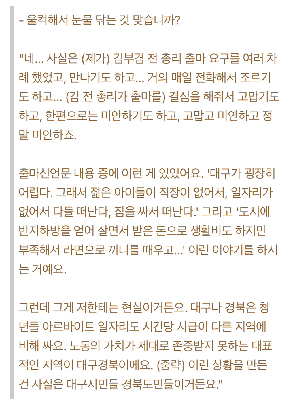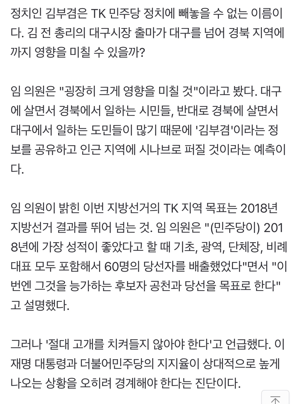 [정치]임미애 의원이 눈물 흘린 이유 작성자록스 D 지벡|작성시간26.03.30|조회수1,733 목록 댓글 5 글자크기 작게가 글자크기 크게가 https://naver.me/xZKxkFyj임미애가 김부겸 출마선언 때 눈물 흘린 이유김부겸 전 국무총리의 대구광역시장 선거 출마 일성에 눈물을 흘린 사람이 있었다. 더불어민주당 경북도당 위원장인 임미애 의원(비례대표)이다. 왜 울기까지? 임미애 의원은 30일 오마이TV '이n.news.naver.com 다음검색 현재 게시글 추가 기능 열기 북마크 공유하기 신고 센터로 신고 댓글 댓글 5 댓글쓰기 답글쓰기 댓글 리스트 작성자김건희 | 작성시간 26.03.30 임미애 위원은 이번에 경북지사로 나오실줄 알았는데 아니군요 작성자담곰이 | 작성시간 26.03.30 이번에도 국힘뽑히면 영원히 ㅂㅂ다 작성자카리나 네뷸라 | 작성시간 26.03.30 임미애 진짜 고생 많음... 계속 응원합니다 작성자일취월장 | 작성시간 26.03.30 응원합니다! 작성자Evan | 작성시간 26.03.30 임미애 의원도 경북에서 매번 떨어져서 이번에 비례로 된거임. 댓글 전체보기