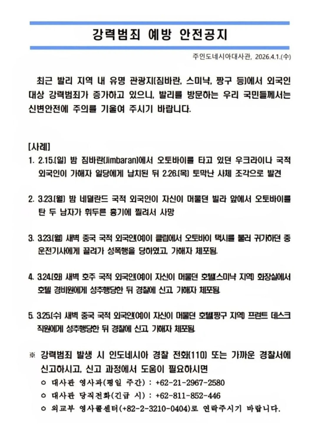 인도네시아대사관 발리 지역 강력범죄 예방 공지.jpg 작성자Google|작성시간26.04.02|조회수2,026 목록 댓글 9 글자크기 작게가 글자크기 크게가 다음검색 현재 게시글 추가 기능 열기 북마크 공유하기 신고 센터로 신고 댓글 댓글 9 댓글쓰기 답글쓰기 댓글 리스트 작성자인생은타이밍 | 작성시간 26.04.02 발리 위험해졌네 새벽에도 잼나게 놀던 곳인데 작성자안녕하 | 작성시간 26.04.02 헐 발리 무서운 곳이네 작성자가운데의맙소사 | 작성시간 26.04.02 ㄷㄷ 작성자주ㅕ니애비 | 작성시간 26.04.02 많이 무서운데? ㄷㄷㄷ 작성자매니 | 작성시간 26.04.02 남자는 죽고 여자는 성폭행이고 뭐야 여기 ㄷㄷ 댓글 전체보기
