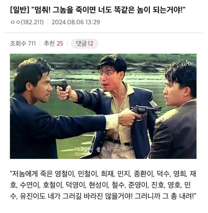 영화나 드라마보다가 빡치는 장면 작성자가을날4|작성시간26.04.02|조회수4,608 목록 댓글 4 글자크기 작게가 글자크기 크게가 여기까지 오는데 졸개들 모두 끔살한 건 까먹음 다음검색 현재 게시글 추가 기능 열기 북마크 공유하기 신고 센터로 신고 댓글 댓글 4 댓글쓰기 답글쓰기 댓글 리스트 작성자H_Crespo | 작성시간 26.04.02 ㄷㄷㄷㄷ 작성자피에르 가슬리 | 작성시간 26.04.02 ㅋㅋㅋ 그래서 요즘엔 저런 말 없이 걍 바로 쏴죽이는 영화들도 꽤 많음 작성자곰 갈매기 프로미 스파이더 | 작성시간 26.04.02 그럴라고 여기까지 온거임. 작성자블루스카이 | 작성시간 26.04.02 첩혈가두장학우도 양조위도 연기 참 좋았죠 댓글 전체보기