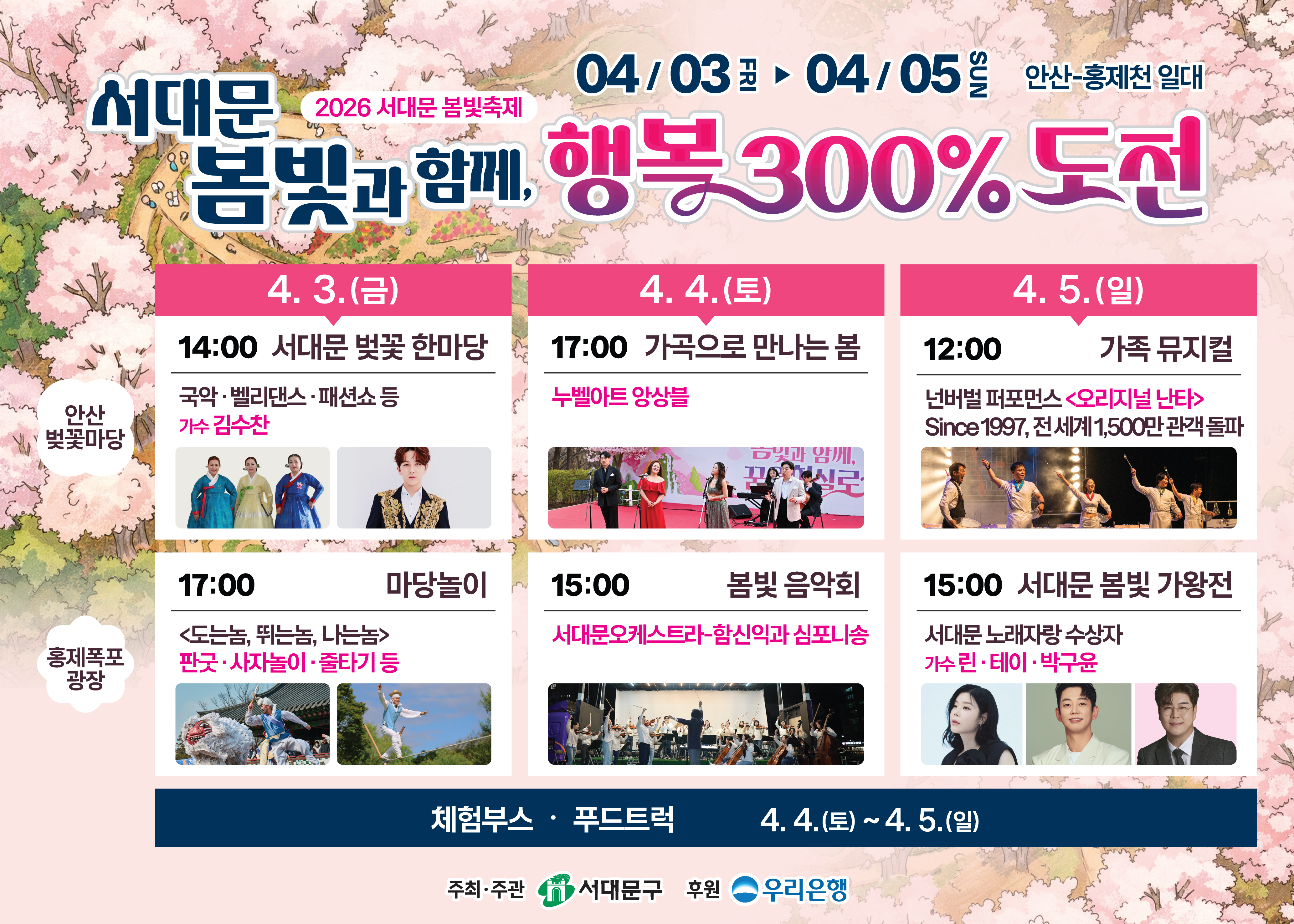 [정보]2026 서대문 봄빛축제 공연 출연진 라인업.jpg 작성자탱구|작성시간26.04.02|조회수546 목록 댓글 3 글자크기 작게가 글자크기 크게가 다음검색 현재 게시글 추가 기능 열기 북마크 공유하기 신고 센터로 신고 댓글 댓글 3 댓글쓰기 답글쓰기 댓글 리스트 작성자오스먼트 | 작성시간 26.04.02 와 테이는 주말에 연속으로 행사 뛰는군요! 작성자정예린2 | 작성시간 26.04.02 테이 ㄷㄷ 작성자奇誠庸 | 작성시간 26.04.03 가야지 ㅎ 댓글 전체보기