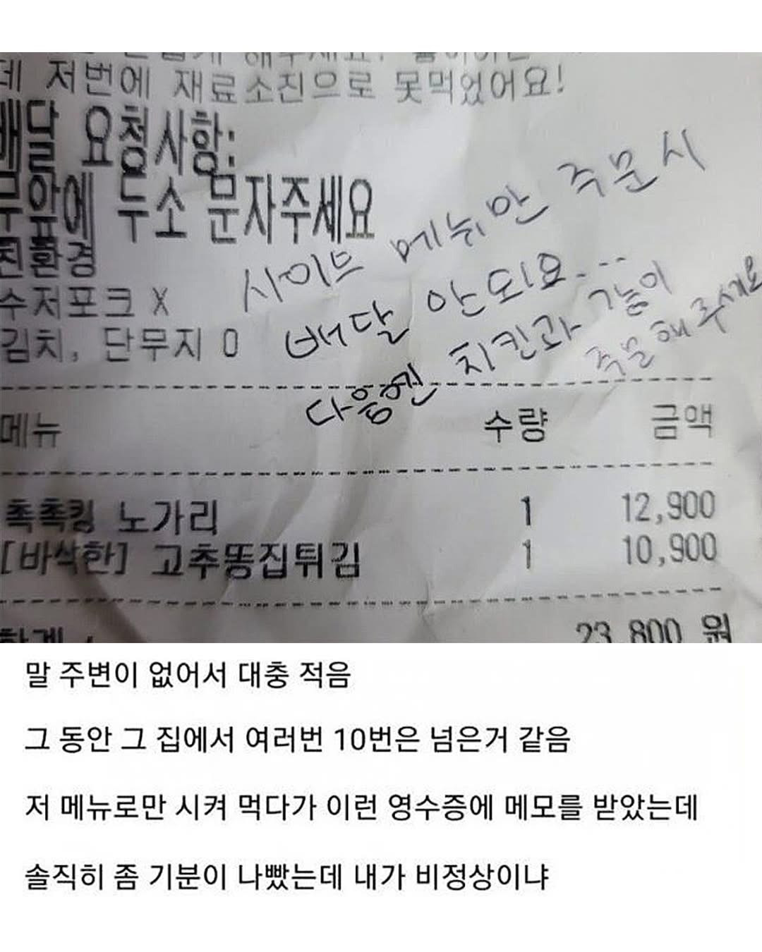 사이드 메뉴만 주문한 손님 논란 작성자가을날4|작성시간26.04.03|조회수3,186 목록 댓글 28 글자크기 작게가 글자크기 크게가 사이드메뉴래도 저 돈이면 치킨 한마리인데 뭐가 문제냐사장이 단골이라 봐준거지, 애초에 사이드메뉴만 시키는 게 문제로 의견 갈리는중 다음검색 현재 게시글 추가 기능 열기 북마크 공유하기 신고 센터로 신고 댓글 댓글 28 댓글쓰기 답글쓰기 댓글 리스트 작성자트렌트 알렉산더 아놀드66 | 작성시간 26.04.03 뭔상관? 최소주문 맞추고 메뉴에 있음 시키는거지... 작성자수인번호503 | 작성시간 26.04.03 사이드만 주문 못하게 공지를 하던가. 막던가 작성자담시즌엔 우승하나 | 작성시간 26.04.03 치킨이 이익이 많이남나? 작성자이게뭔일이람 | 작성시간 26.04.04 버거킹에서 콘샐러드만 5개씩 시키곤 하능데ㅜ안 됨? 답댓글 작성자누구든보내버릴줄알아 | 작성시간 26.04.04 버거킹은 웬만해선 직영점이라 신경 안쓰죠 댓글 전체보기
