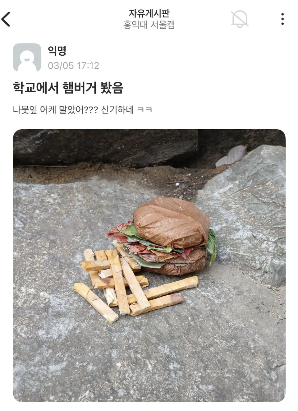 [유머]홍대 에타에 올라온 햄버거.jpg 작성자solid|작성시간26.04.04|조회수6,203 목록 댓글 2 글자크기 작게가 글자크기 크게가 다음검색 현재 게시글 추가 기능 열기 북마크 공유하기 신고 센터로 신고 댓글 댓글 2 댓글쓰기 답글쓰기 댓글 리스트 작성자찹쌀뜨억 | 작성시간 26.04.04 진짜 잘 만들었네 ㄷㄷ 작성자아메리카노 | 작성시간 26.04.04 미대의 나라 ㄷㄷ 댓글 전체보기