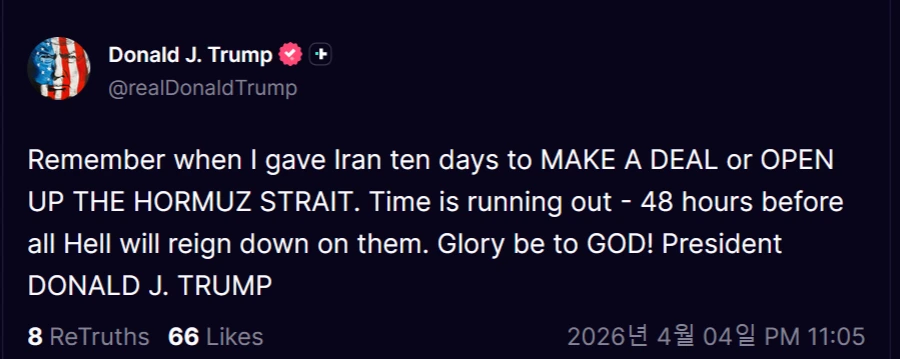 내가 이란에게 10일 줬다. 협상하든지, 아니면 호르무즈 해협 열라고. 다들 기억하지?이제 시간 거의 끝났다 — 48시간 남았다.