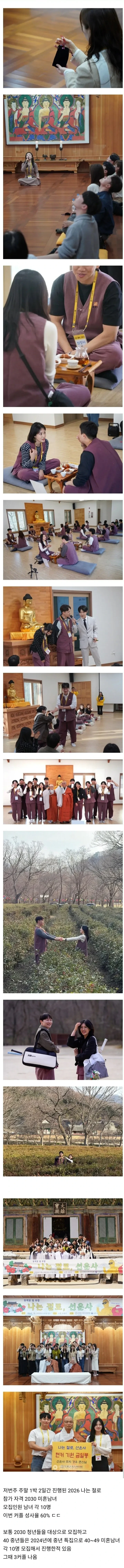 [기타]커플 성공률이 60% 나 된다는 나는 절로 소개팅 작성자Panzerkampfwagen|작성시간26.04.07|조회수26,037 목록 댓글 11 글자크기 작게가 글자크기 크게가 다음검색 현재 게시글 추가 기능 열기 북마크 공유하기 신고 센터로 신고 댓글 댓글 11 댓글쓰기 답글쓰기 댓글 리스트 작성자메리다 | 작성시간 26.04.07 절로 꺼지랬더니 절로가서 커플하고 있네 이것들이... 작성자페르소나 | 작성시간 26.04.07 븉여 핸섬! 작성자독거노인 | 작성시간 26.04.07 나도 가보고싶당 작성자한로로로2 | 작성시간 26.04.07 요즘 불교 엄청 힙하네 ㅋㅋㅋ 작성자그래도아직은탱구 | 작성시간 26.04.07 ㄷㄷㄷㄷ 댓글 전체보기
