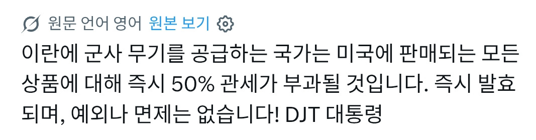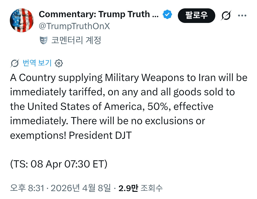 [정치]트럼프 트루스소셜: 이란에게 무기 공급하는 국가는 관세 50% 작성자서스날|작성시간26.04.08|조회수962 목록 댓글 5 글자크기 작게가 글자크기 크게가 https://x.com/TrumpTruthOnX/status/2041841354536591399?s=20 다음검색 현재 게시글 추가 기능 열기 북마크 공유하기 신고 센터로 신고 댓글 댓글 5 댓글쓰기 답글쓰기 댓글 리스트 작성자3LungPark | 작성시간 26.04.08 기승전관세무새 ㅋㅋㅋㅋㅋㅋㅋㅋㅋㅋㅋㅋㅋㅋㅋ 작성자롭슨 | 작성시간 26.04.08 DTJ! 작성자한교동 | 작성시간 26.04.08 그럼 이란에 대항할수있게무기 공급한 국가는 관세 깎아줘~ 작성자둥그리 | 작성시간 26.04.08 깡패 작성자I.B.I LUV | 작성시간 26.04.09 중국이나 러시아에게 그러겠다는 거지?? 해라 젭알.... 댓글 전체보기