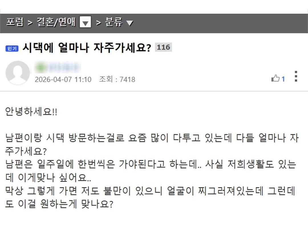 작성자하늘빛바다 작성시간 26.04.09 요새는 시댁이라고도 안합니다. 시가라고 하지..