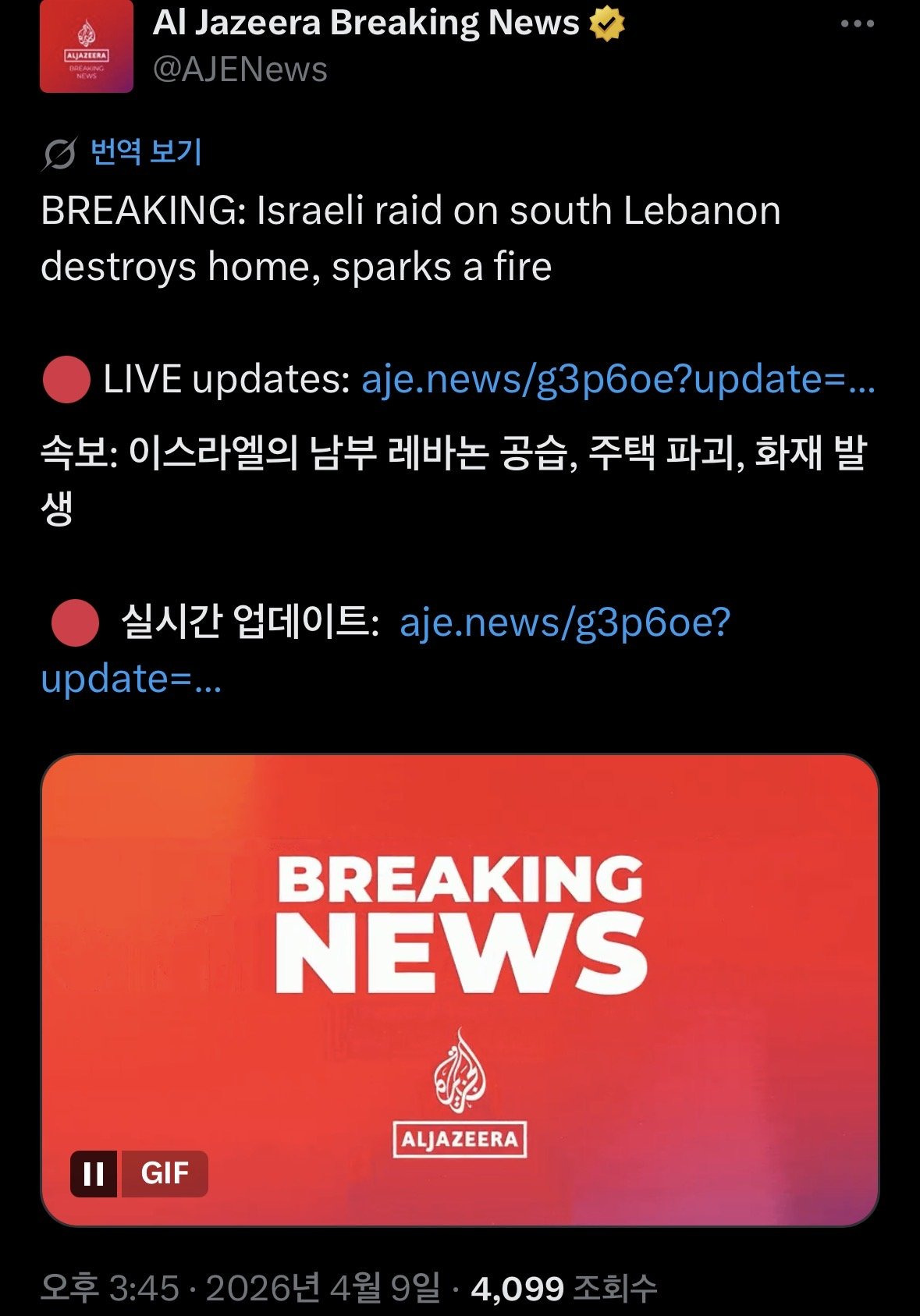 [SNS]속보] 이스라엘의 남부 레바논 공습, 주택 파괴, 화재 발생 작성자데니스 코펜하겐|작성시간26.04.09|조회수591 목록 댓글 2 글자크기 작게가 글자크기 크게가 다음검색 현재 게시글 추가 기능 열기 북마크 공유하기 신고 센터로 신고 댓글 댓글 2 댓글쓰기 답글쓰기 댓글 리스트 작성자카리나 네뷸라 | 작성시간 26.04.09 천벌받아라 나쁜놈들 작성자정신아픔이 | 작성시간 26.04.09 ㅠㅠ 댓글 전체보기