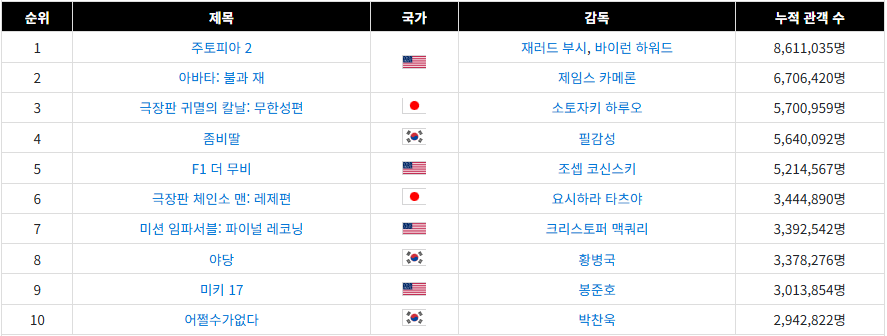 [영화]2025년 한국 영화시장 흥행 TOP 10.jpg 작성자탱구|작성시간26.04.09|조회수329 목록 댓글 2 글자크기 작게가 글자크기 크게가 다음검색 현재 게시글 추가 기능 열기 북마크 공유하기 신고 센터로 신고 댓글 댓글 2 댓글쓰기 답글쓰기 댓글 리스트 작성자오스먼트 | 작성시간 26.04.09 대단하다 퀴칼.. 작성자크리수마수 | 작성시간 26.04.10 1 2 4 7 9 10 극장에서 봤는데 제일 돈 아까왔던 영화는 좀비딸 댓글 전체보기