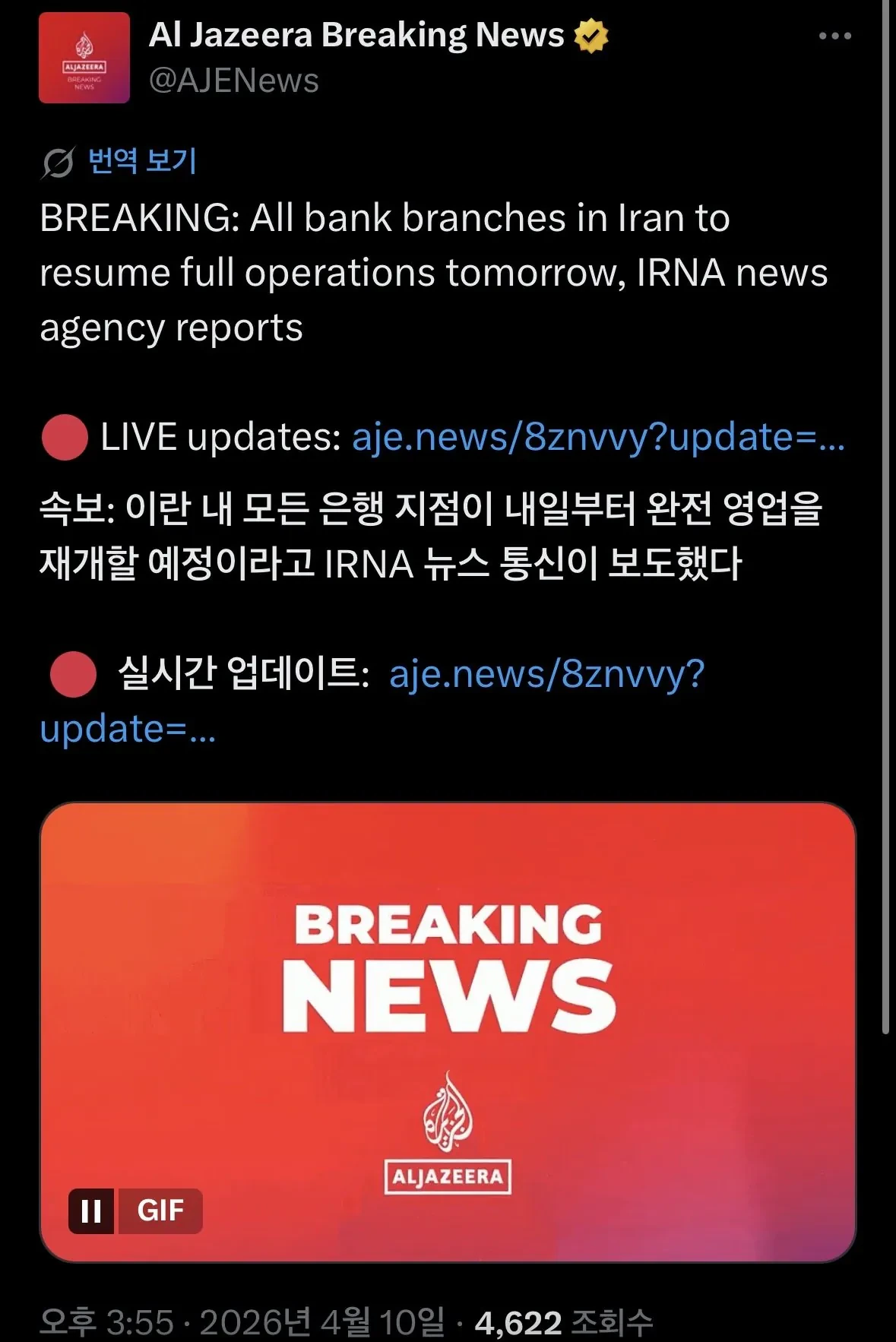 [SNS]속보: 이란 내 모든 은행 지점이 내일부터 완전 영업을 재개할 예정이라고 IRNA 뉴스 통신이 보도했다 작성자데니스 코펜하겐|작성시간26.04.10|조회수1,018 목록 댓글 1 글자크기 작게가 글자크기 크게가 다음검색 현재 게시글 추가 기능 열기 북마크 공유하기 신고 센터로 신고 댓글 댓글 1 댓글쓰기 답글쓰기 댓글 리스트 작성자베토벤 | 작성시간 26.04.10 협상결과 스포일러? 댓글 전체보기