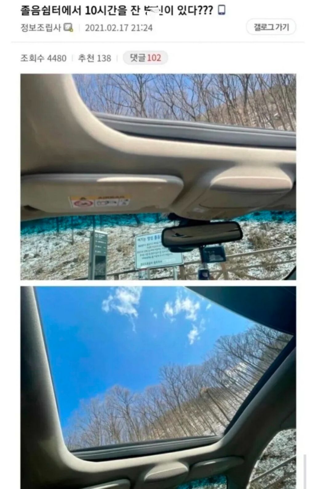 작성자제갈량 공명 작성시간 26.04.13 운전석에서 불편하게 잤을텐데도 10시간 꿀잠이면 진짜 몸이 피곤했던거네 ㄷㄷ