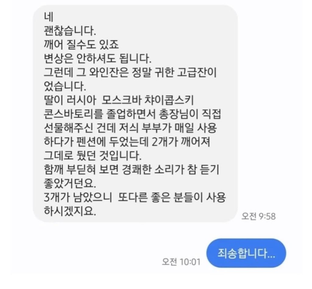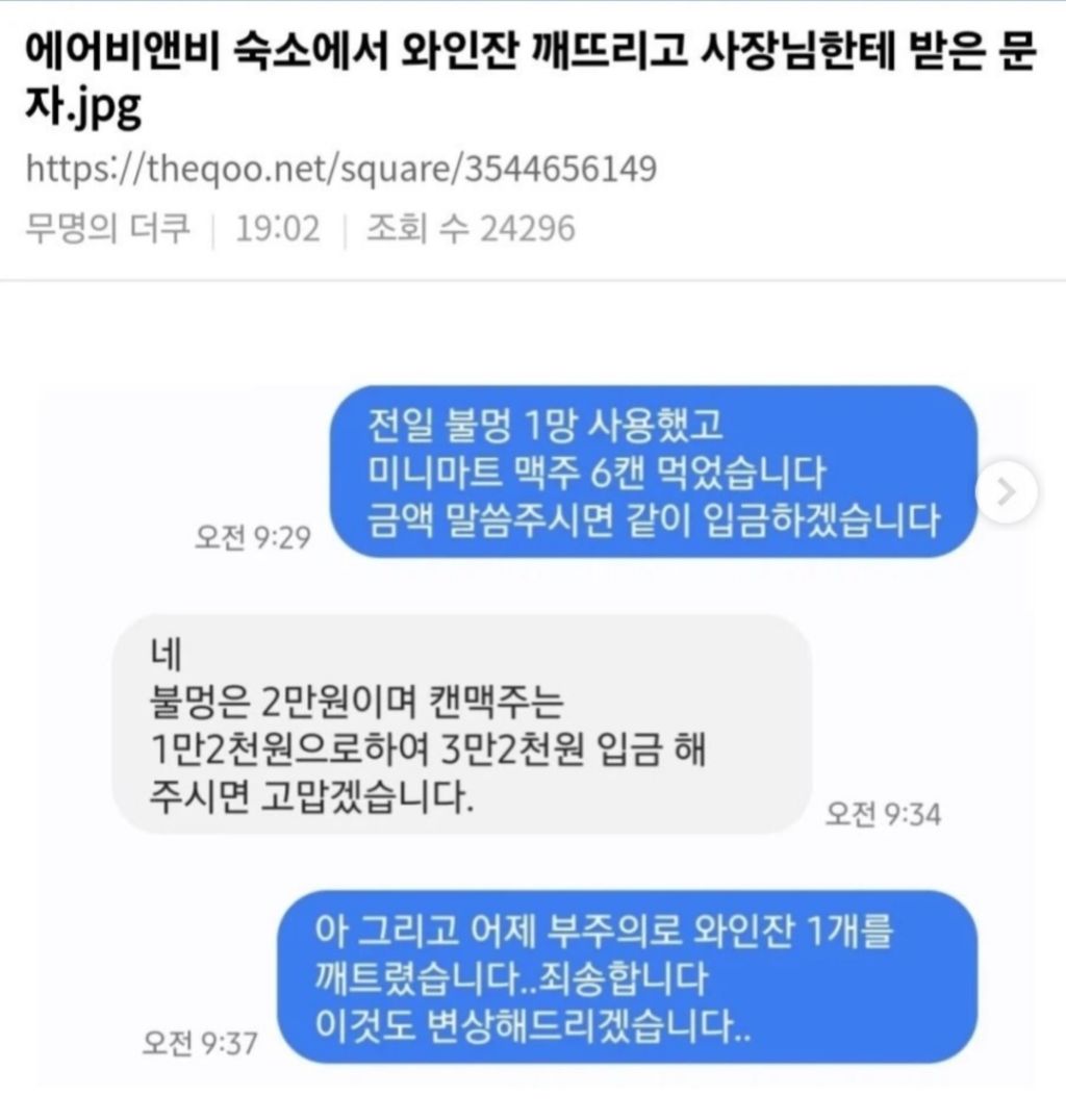 에어비앤비 숙소에서 와인잔 깨뜨리고 사장님한테 받은 문자 작성자러바오|작성시간26.04.15|조회수15,403 목록 댓글 12 글자크기 작게가 글자크기 크게가 다음검색 현재 게시글 추가 기능 열기 북마크 공유하기 신고 센터로 신고 댓글 댓글 12 댓글쓰기 답글쓰기 댓글 리스트 작성자3.141592 | 작성시간 26.04.15 그냥 금액 불러주세요 ㅋㅋㅋㅋㅋㅋㅋㅋㅋㅋㅋㅋㅋㅋㅋㅋㅋㅋㅋ 작성자밀키스 | 작성시간 26.04.15 흑흑 작성자피버노바 | 작성시간 26.04.15 ㄷㄷㄷ 작성자I.B.I LUV | 작성시간 26.04.15 그냥 더 미안하게 만드시네 ㅋㅋㅋㅋㅋㅋㅋㅋㅋㅋ 작성자아메리카노 | 작성시간 26.04.16 ㅋㅋㅋㅋㅋㅋㅋ 댓글 전체보기