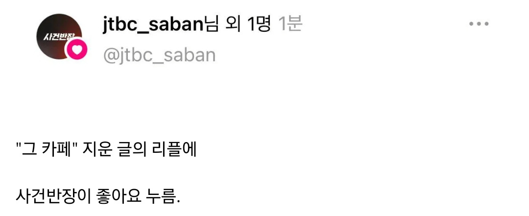 [기타]사건반장 입장 작성자서스날|작성시간26.04.15|조회수1,238 목록 댓글 1 글자크기 작게가 글자크기 크게가 (오늘 불거진 김해 카페 이슈) 다음검색 현재 게시글 추가 기능 열기 북마크 공유하기 신고 센터로 신고 댓글 댓글 1 댓글쓰기 답글쓰기 댓글 리스트 작성자폴포그바 | 작성시간 26.04.15 무슨 얘기지… 댓글 전체보기