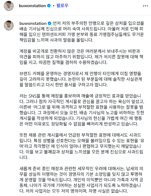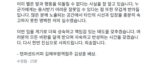 작성자월화수목금토일 작성시간 26.04.15 많은 사람들이 이런 거에 대해 사과 혹은 어떤 이는 금전적 보상을 이야기 하기도 하지만 사실 사람 자존심, 인격을 짓밟은 건 그 어떤 진심어린 사과로도 회복이 안 됨..