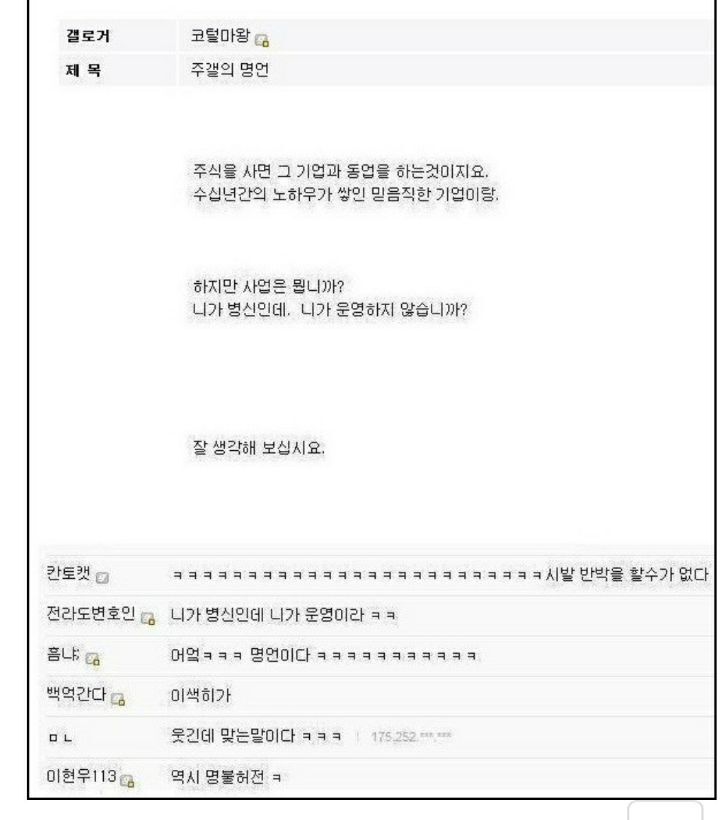 10년이 지나도 회자되는 주갤 명언 작성자유티날개피는중|작성시간21.01.09|조회수2,278 목록 댓글 2 글자크기 작게가 글자크기 크게가 다음검색 현재 게시글 추가 기능 열기 북마크 공유하기 신고 센터로 신고 댓글 댓글 2 댓글쓰기 답글쓰기 댓글 리스트 작성자팬텀갓 | 작성시간 21.01.09 현자 작성자doldoli | 작성시간 21.01.09 명언이네 댓글 전체보기