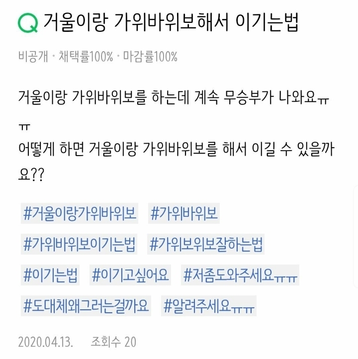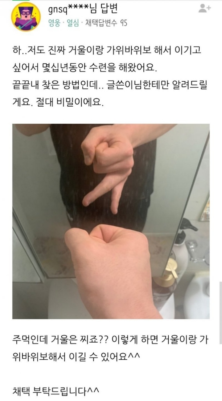 거울이랑 가위바위보 이기는 방법 작성자락제국|작성시간20.05.28|조회수309 목록 댓글 3 글자크기 작게가 글자크기 크게가 ....... 다음검색 현재 게시글 추가 기능 열기 북마크 공유하기 신고 센터로 신고 댓글 댓글 3 댓글쓰기 답글쓰기 댓글 리스트 작성자토티데로시 | 작성시간 20.05.28 천잰데? 작성자Take Your Time | 작성시간 20.05.28 올 작성자개깡이주인 | 작성시간 20.05.28 올!!! 댓글 전체보기