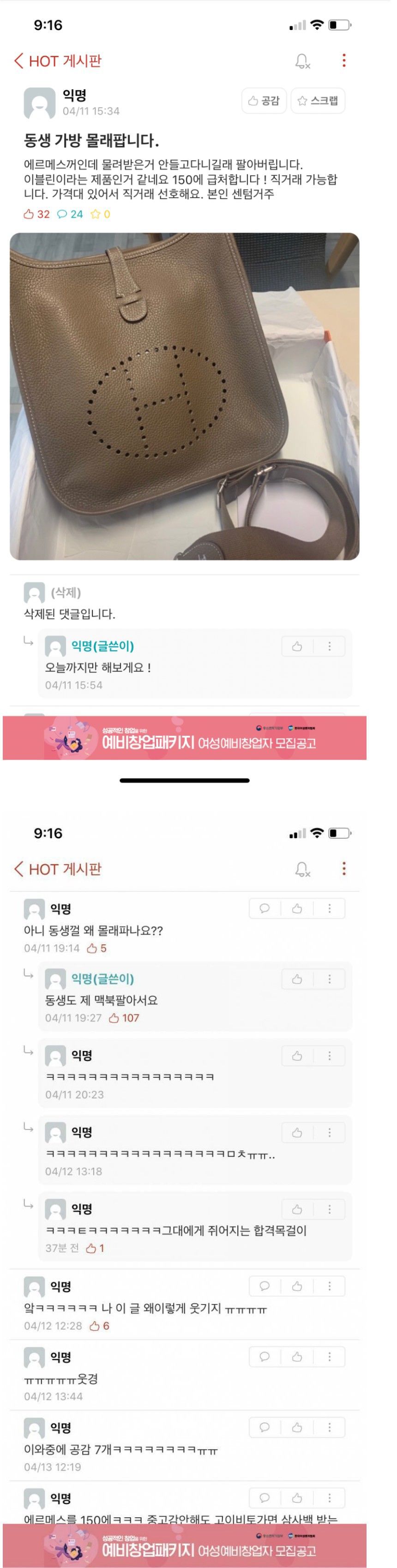 동생 가방 급처분합니다. 작성자조반|작성시간20.06.30|조회수1,160 목록 댓글 3 글자크기 작게가 글자크기 크게가 다음검색 현재 게시글 추가 기능 열기 북마크 공유하기 신고 센터로 신고 댓글 댓글 3 댓글쓰기 답글쓰기 댓글 리스트 작성자다현 | 작성시간 20.06.30 150에서 더 올려야겠는데 작성자BENZ_Sonny | 작성시간 20.06.30 에르메스를 어떻게 150에 팔 생각을 하지.. 주작이겠지 작성자몽념, 낙화대 | 작성시간 20.06.30 설마 우리학교 에타인가 하고 들어가봤는데 진짜였던;ㅋㅋ 댓글 전체보기