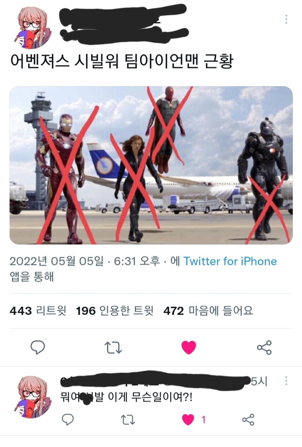 [영화][스포] 어벤져스 시빌워 '팀 아이언맨' 근황 작성자Riverdale|작성시간22.05.06|조회수1,702 목록 댓글 7 글자크기 작게가 글자크기 크게가 아이언맨 사망 블랙위도우 사망 비전 사망 워머신 다리 불구 스파이더맨 피터 파커 존재 자체가 잊혀짐 다음검색 현재 게시글 추가 기능 열기 북마크 공유하기 신고 센터로 신고 댓글 댓글 7 댓글쓰기 답글쓰기 댓글 리스트 작성자망고땡보 | 작성시간 22.05.06 완다 혼자 7명 쌉가능ㅋ 답댓글 작성자램지호구 | 작성시간 22.05.06 심지어 완다는 캡아편... 작성자tnatropmI | 작성시간 22.05.06 ㅋㅋㅋㅋ 작성자드림캐쳐 | 작성시간 22.05.06 ㅋㅋㅋㅋ 작성자다현 | 작성시간 22.05.10 ㅋㅋㅋㅋㅋ 댓글 전체보기