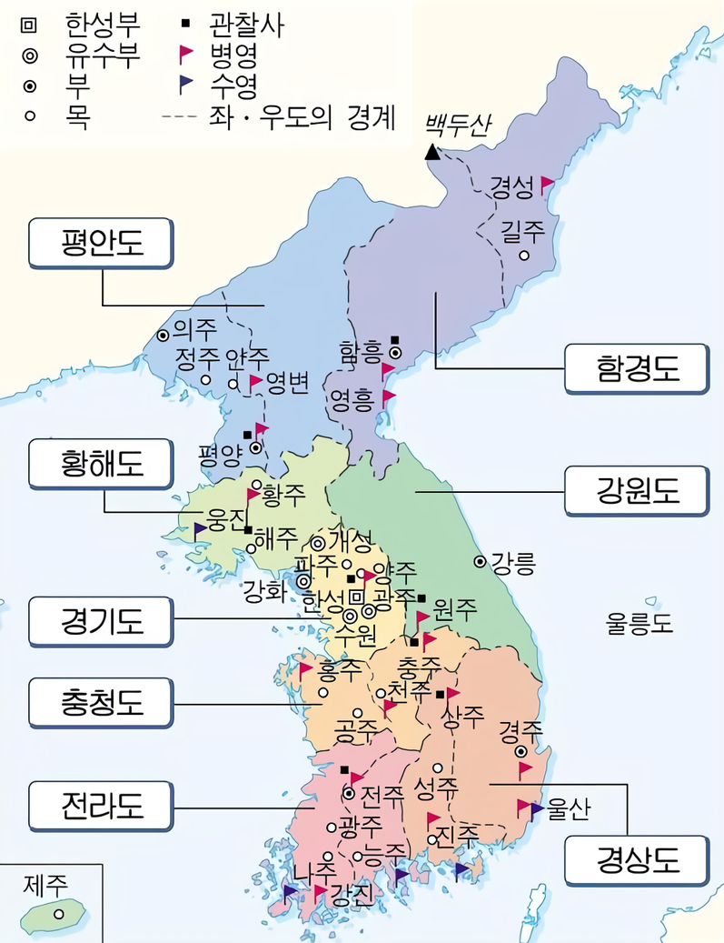 또한 수령들의 부패나 실정을 감독하기 위해 각 도에 관찰사를 파견, 상설기관을 세워 거주와 통치를 가능케 하였으며