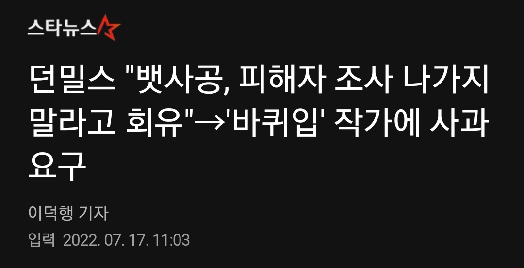 이에 던밀스는 "이런 사건이 터지고도 그 XX 스토리가 보고 싶어서 이딴 댓글을 다냐"며 "너도 똑바로 사과해. 이런 게 다 피해자 죽이는 거야. 마치 별 일 아닌 걸로 만들지마"라고 전했다. 현재 해당 작가의 SNS는 비공개로 전환된 상태다.