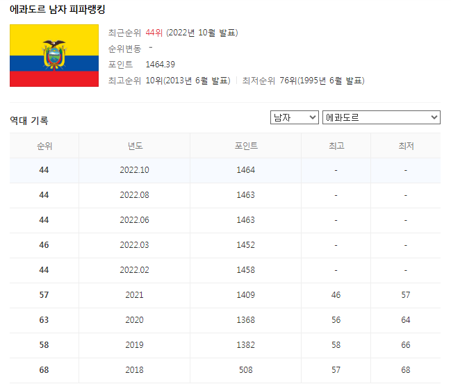 피파랭킹은 예선 통과한 아시아팀이 남미 강팀 아닌 남미팀보다 유리함..에콰도르는 남미예선에서 강팀들에게 처맞는 반면 아시아팀은 예선에서 상대팀들 처부수기 때문에