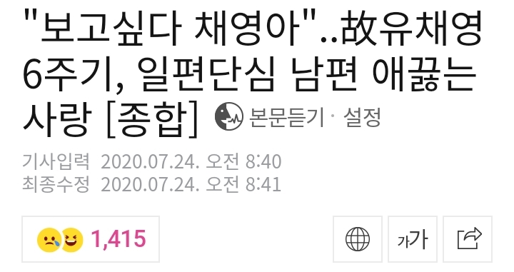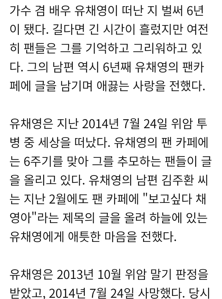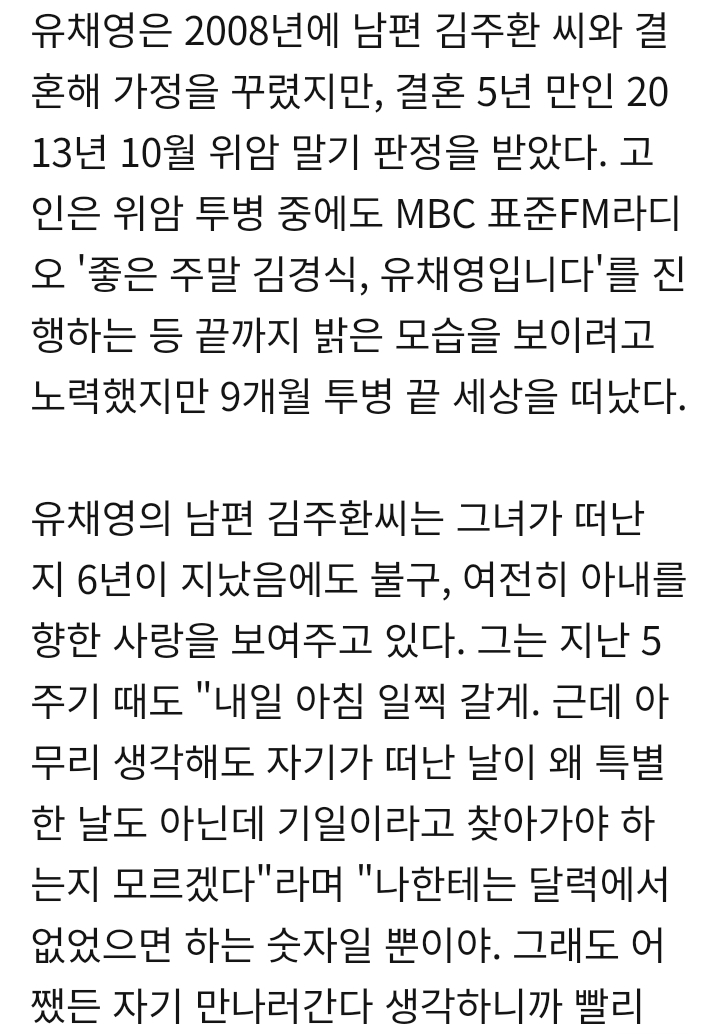 [기사]"보고싶다 채영아"..故유채영 6주기, 일편단심 남편 애끓는 사랑 작성자Dušan Tadić|작성시간20.07.24|조회수3,028 목록 댓글 14 글자크기 작게가 글자크기 크게가 http://naver.me/5o2yGHkPㅜㅜㅜ 다음검색 현재 게시글 추가 기능 열기 북마크 공유하기 신고 센터로 신고 댓글 댓글 14 댓글쓰기 답글쓰기 댓글 리스트 작성자바티골no.9 | 작성시간 20.07.24 젊은데 위암이 걸리네요장진영도 그렇고 안타깝다ㅠ 작성자황의조♥️ | 작성시간 20.07.24 ㅠㅠㅠㅠ 작성자개소리하는 놈한테 개짖는 멍멍이 | 작성시간 20.07.24 평소에 음료수를 달고 살았다고하던데.. 작성자yunalove | 작성시간 20.07.24 아직도 안믿긴다,,,,, 작성자블럭 | 작성시간 20.07.24 할아버지랑 같은 납골당 계셨는데... 힘내시길.. 댓글 전체보기