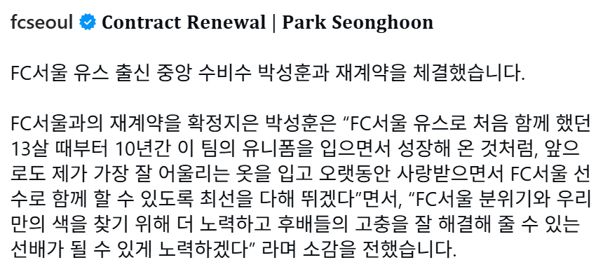 樂soccer [☆서울][오피셜] FC서울, 성골 유스 센터백 박성훈 재계약 작성시간25.12.30|조회수2,752 목록 댓글 10 글자크기 작게가 글자크기 크게가 https://www.instagram.com/p/DS35dohkRko/?utm_source=ig_web_copy_link&igsh=NTc4MTIwNjQ2YQ== 25시즌 15경기 1골 다음검색 현재 게시글 추가 기능 열기 북마크 공유하기 신고 센터로 신고 댓글 10 댓글 리스트 작성시간 25.12.30 작성시간 25.12.30 예스!!!!! 작성시간 25.12.30 캬캬캬 좋은 소식 작성시간 25.12.30 전재준!!! 작성시간 25.12.30 카페 방문해 더 많은 댓글 만나기!