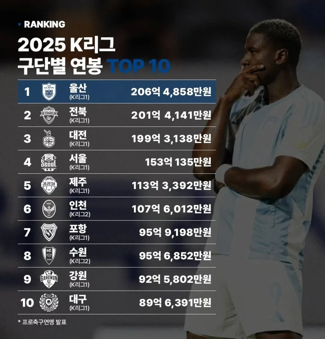 [K리그]2025 k리그 구단별 연봉 TOP 10 작성자rade bogdanovic|작성시간25.12.31|조회수1,098 목록 댓글 6 글자크기 작게가 글자크기 크게가 다음검색 현재 게시글 추가 기능 열기 북마크 공유하기 신고 센터로 신고 댓글 댓글 6 댓글쓰기 답글쓰기 댓글 리스트 작성자길막극혐 | 작성시간 25.12.31 울산은 참 작성자King of asia ULSAN | 작성시간 25.12.31 인건비 206억인데 돈 없다고? 누가 믿냐 작성자나만의그대모습 | 작성시간 25.12.31 뭔가 서울만 띄어쓰기가 달라 불편하네 ㅋㅋㅋㅋㅋ 억단위 맞춰주지 아우 ㅋㅋㅋㅋ 작성자포미남 | 작성시간 25.12.31 포항은 올해 그래도 하위권 아니네 ㅎㅎ 작성자블링블링 | 작성시간 25.12.31 강원 올시즌 잘버텼다. 댓글 전체보기