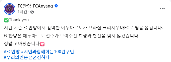 [☆안양][오피셜] 안양 에두아르도, 크리시우마로 이적 작성자바이언2|작성시간26.01.03|조회수408 목록 댓글 1 글자크기 작게가 글자크기 크게가 https://www.facebook.com/FCAnyangOfficial 다음검색 현재 게시글 추가 기능 열기 북마크 공유하기 신고 센터로 신고 댓글 댓글 1 댓글쓰기 답글쓰기 댓글 리스트 작성자김건희 | 작성시간 26.01.03 결국 시즌끝날때까지 리그템포에 적응을 못하던... 미드필더인데 댓글 전체보기