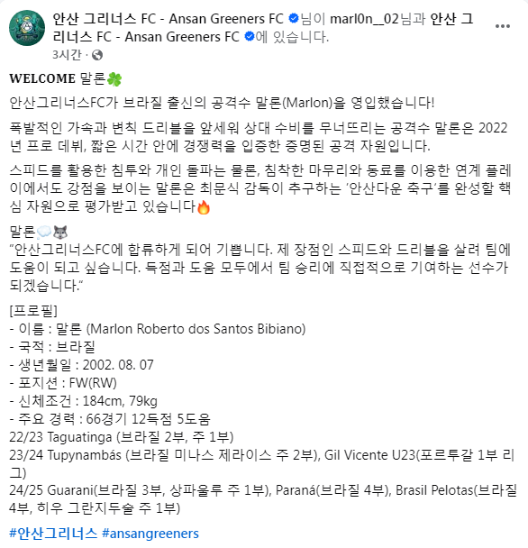 [☆안산][오피셜] 안산, 브라질 출신 말론 영입 작성자바이언2|작성시간26.01.05|조회수307 목록 댓글 1 글자크기 작게가 글자크기 크게가 https://www.facebook.com/ansangreenersfc 다음검색 현재 게시글 추가 기능 열기 북마크 공유하기 신고 센터로 신고 댓글 댓글 1 댓글쓰기 답글쓰기 댓글 리스트 작성자도그허니잼 | 작성시간 26.01.05 안산포풍영입..ㄷㄷ 성남 뭐하냐 댓글 전체보기