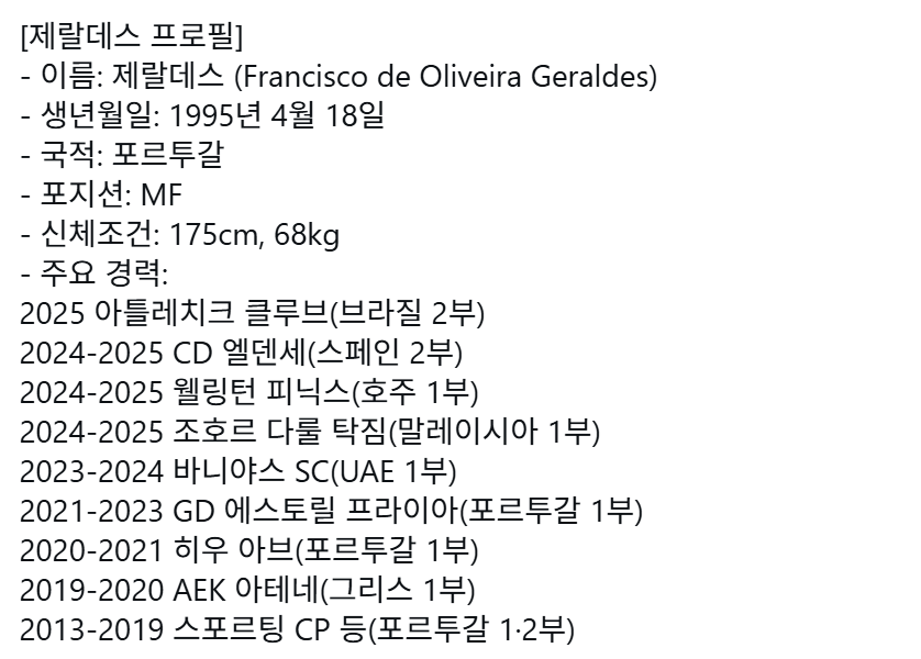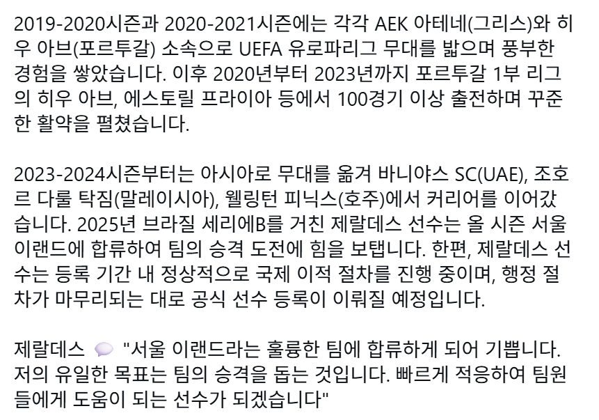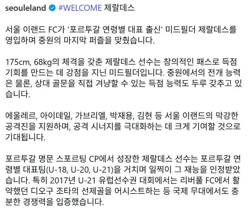 [☆서울E][오피셜] 서울 이랜드, 포르투갈 연령별 대표 출신 MF 제랄데스 영입 작성자서스날|작성시간26.03.26|조회수2,927 목록 댓글 16 글자크기 작게가 글자크기 크게가 https://www.instagram.com/reel/DWVjpjKjTE7/?utm_source=ig_web_copy_link&igsh=NTc4MTIwNjQ2YQ== 다음검색 현재 게시글 추가 기능 열기 북마크 공유하기 신고 센터로 신고 댓글 댓글 16 댓글쓰기 답글쓰기 댓글 리스트 답댓글 작성자이청득심 | 작성시간 26.03.26 세꿀버리 포르투갈어라서ㅋㅋㅋ 작성자諦めない | 작성시간 26.03.26 수비보강은 안하나 작성자Barcelona | 작성시간 26.03.26 커리어 좋네 작성자치타 | 작성시간 26.03.26 브라질 찍고 온거 신기하네 작성자서울의★박주영 | 작성시간 26.03.27 옛날 수원FC 시시느낌나는거같은데 ㅎㅎ 댓글 전체보기