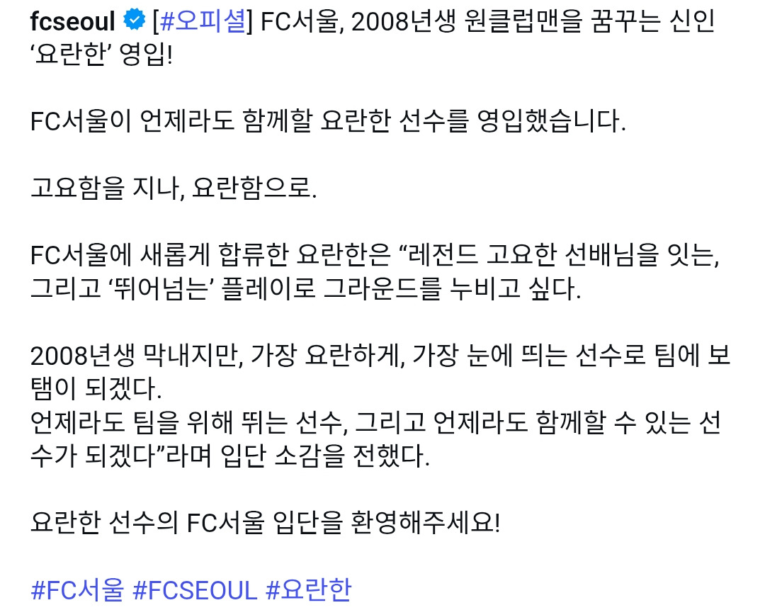 [☆서울][오피셜] FC서울, 2008년생 원클럽맨을 꿈꾸는 신인 ‘요란한’ 영입! 작성자서스날|작성시간26.04.01|조회수6,110 목록 댓글 21 글자크기 작게가 글자크기 크게가 https://www.instagram.com/p/DWk5yFuEbpx/?igsh=aDk5NzdhZXpuMjNr 다음검색 현재 게시글 추가 기능 열기 북마크 공유하기 신고 센터로 신고 댓글 댓글 21 댓글쓰기 답글쓰기 댓글 리스트 작성자평양박치기 | 작성시간 26.04.01 개웃기넼ㅋㅋㅋㅋ 작성자Shea Lacey | 작성시간 26.04.02 요란한 메건 작성자지노신 | 작성시간 26.04.02 ㅋㅋㅋㅋㅋ전직 울산코치였단게 더 만우절일둣 작성자Professor | 작성시간 26.04.02 ㅋㅋㅋㅋㅋㅋㅋㅋㅋㅋㅋㅋㅋㅋㅋㅋ 작성자즐거운세상 | 작성시간 26.04.02 ㅋㅋㅋㅋㅋㅋㅋㅋ 댓글 전체보기
