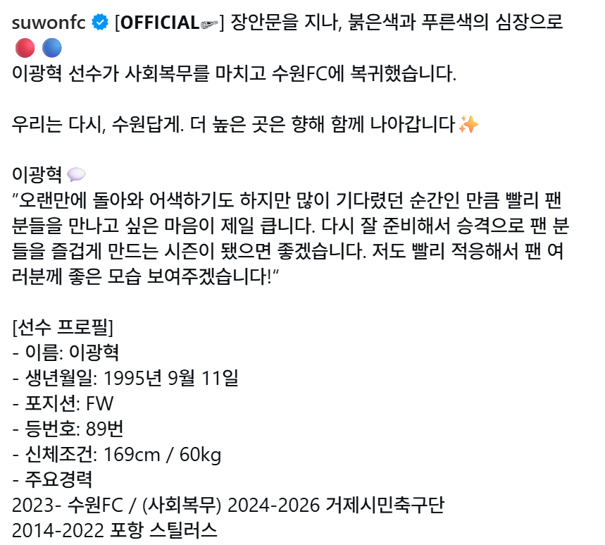 [☆수원FC][오피셜] 수원FC 이광혁, 사회복무 마치고 복귀 작성자서스날|작성시간26.04.09|조회수586 목록 댓글 3 글자크기 작게가 글자크기 크게가 https://www.instagram.com/p/DW5EXYWEWfd/?utm_source=ig_web_copy_link&igsh=MzRlODBiNWFlZA== 다음검색 현재 게시글 추가 기능 열기 북마크 공유하기 신고 센터로 신고 댓글 댓글 3 댓글쓰기 답글쓰기 댓글 리스트 작성자미니언즈 | 작성시간 26.04.09 아 사회복무갔었구나!광혁이 화이팅! 작성자보이콧 | 작성시간 26.04.09 드디어 찐이 와따ㄷㄷ 작성자K리그사랑축구사랑 | 작성시간 26.04.09 실력은 좋은데 너무 유리몸 댓글 전체보기