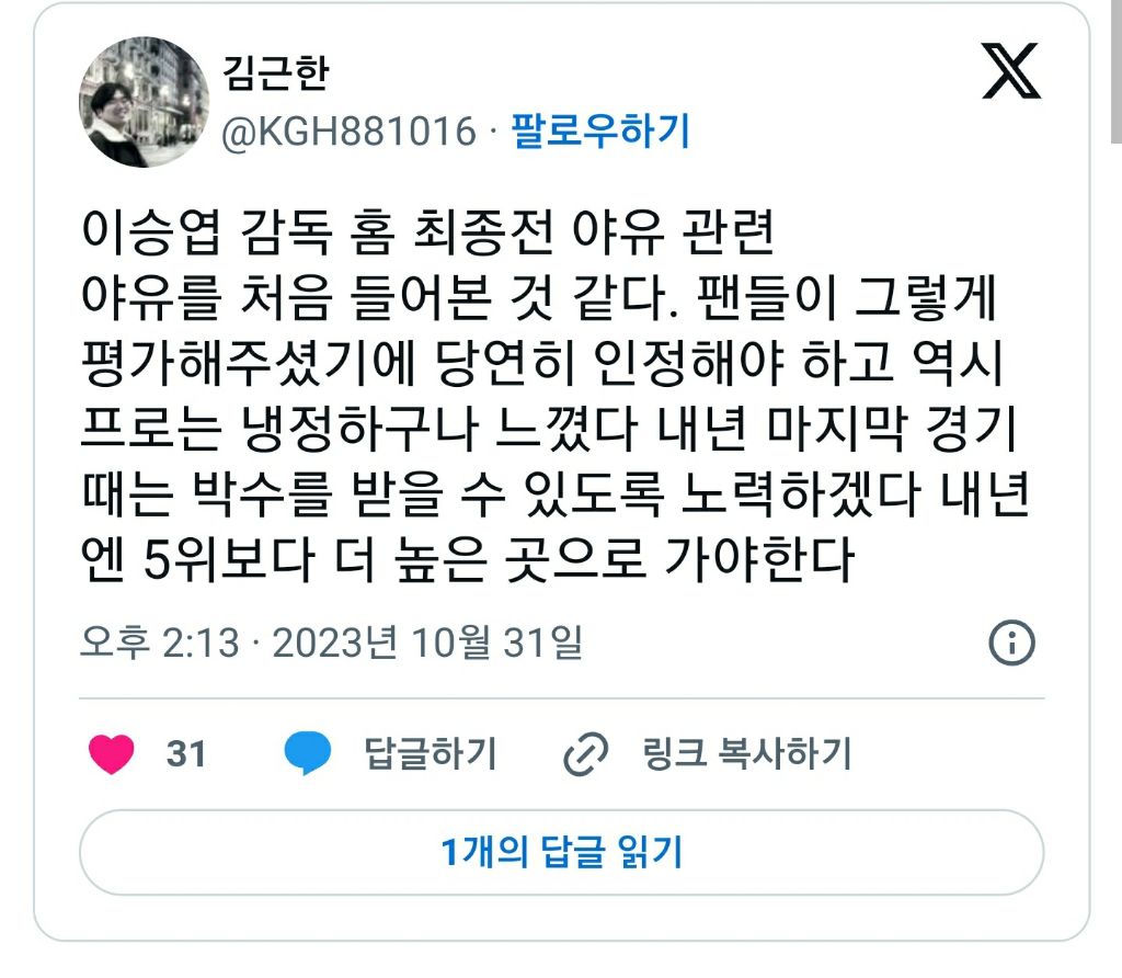 [야구]돌승엽 :: 야유 처음 들어봄 ㅎㅎㅈㅅ 작성자스퍼스랩|작성시간23.10.31|조회수490 목록 댓글 2 글자크기 작게가 글자크기 크게가 다음검색 현재 게시글 추가 기능 열기 북마크 공유하기 신고 센터로 신고 댓글 댓글 2 댓글쓰기 답글쓰기 댓글 리스트 삭제된 댓글입니다. 답댓글 작성자스퍼스랩 작성자 본인 여부 작성자 | 작성시간 23.10.31 어허 이미지 확대 댓글 전체보기
