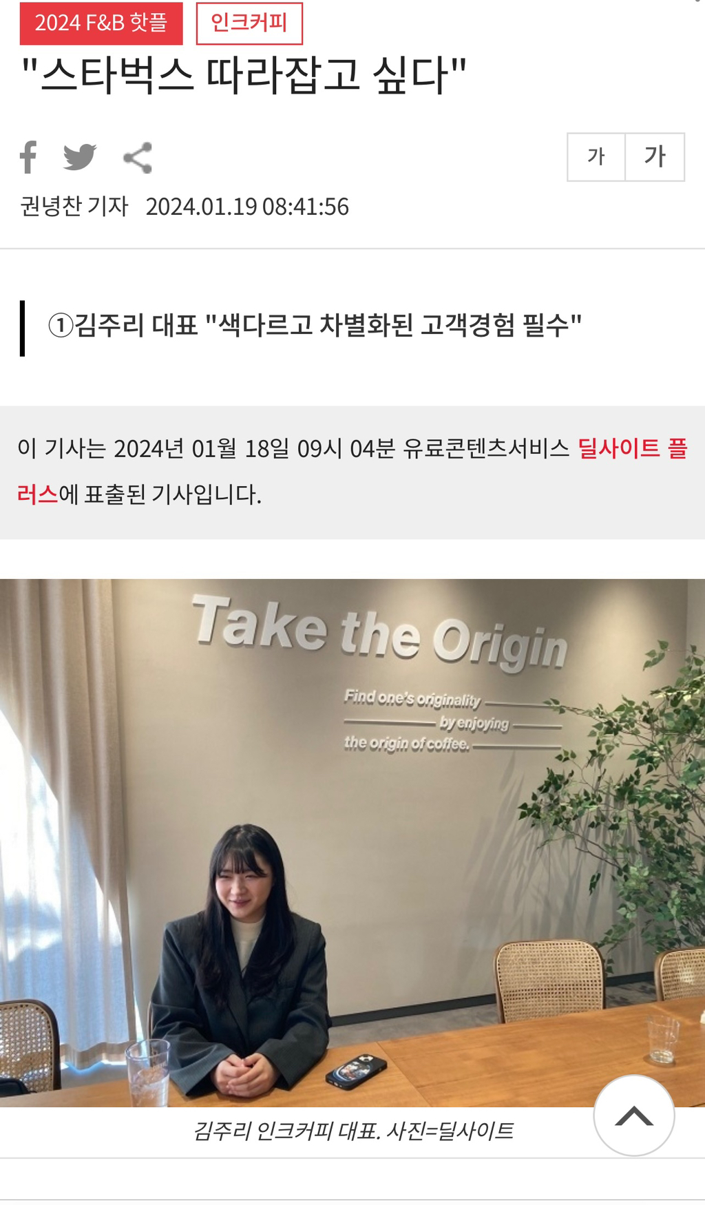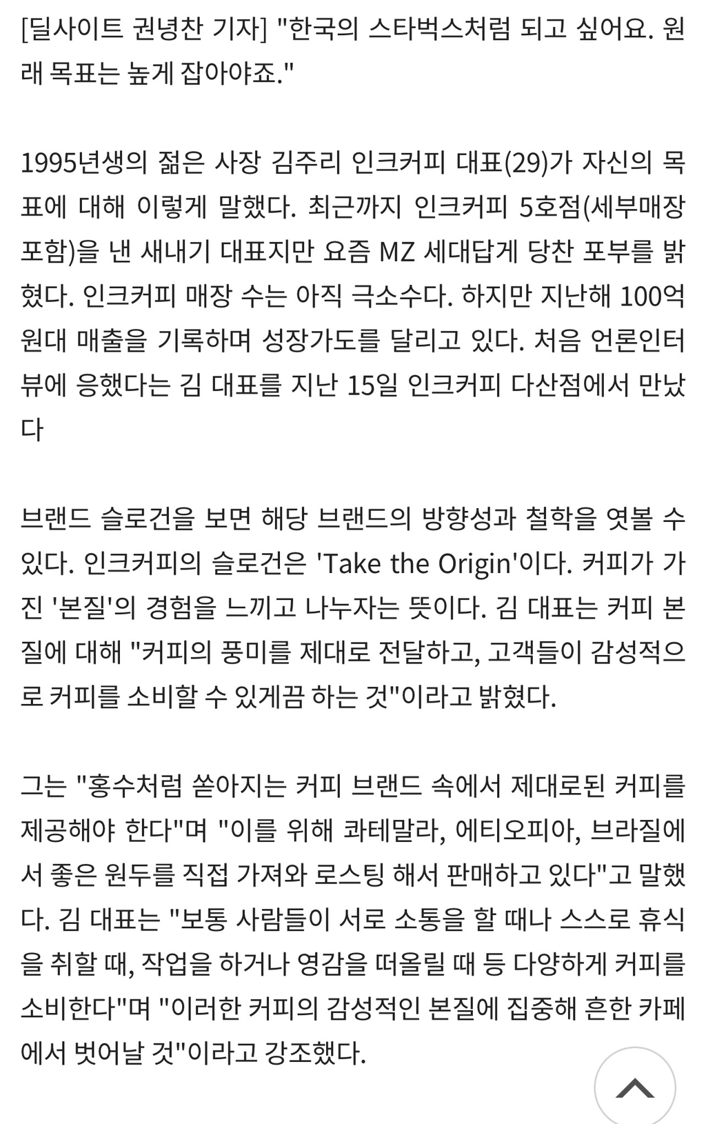 [야구]((약 6주전 기사)) 인크커피 김주리 대표, "스타벅스 따라잡고 싶다." 작성자명박존박잔다르크|작성시간24.03.07|조회수982 목록 댓글 4 글자크기 작게가 글자크기 크게가 https://dealsite.co.kr/articles/116619[2024 F&B 핫플] [인크커피] "스타벅스 따라잡고 싶다" - 딜사이트①김주리 대표 "색다르고 차별화된 고객경험 필수"dealsite.co.kr:443 다음검색 현재 게시글 추가 기능 열기 북마크 공유하기 신고 센터로 신고 댓글 댓글 4 댓글쓰기 답글쓰기 댓글 리스트 작성자디턱스 | 작성시간 24.03.07 이 회사에서 스카웃 제의 왔었는데 기스방의 재앙 같은 회사였을 줄이야… 답댓글 작성자인생은타이밍 | 작성시간 24.03.08 장앤김을 내보낸 ㄷㄷㄷㄷ 작성자jose | 작성시간 24.03.08 김종국 날려줘서 고맙다는 기아팬들이 꽤 있어오ㅋㅋㅋㅋㅋㅋ큐ㅠㅠㅠㅠ웃프네 진짴ㅋㅋㅋ 작성자리윈 | 작성시간 24.03.08 김종국 날려줘서 고맙다 댓글 전체보기