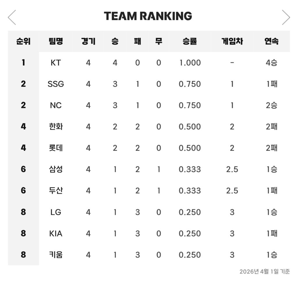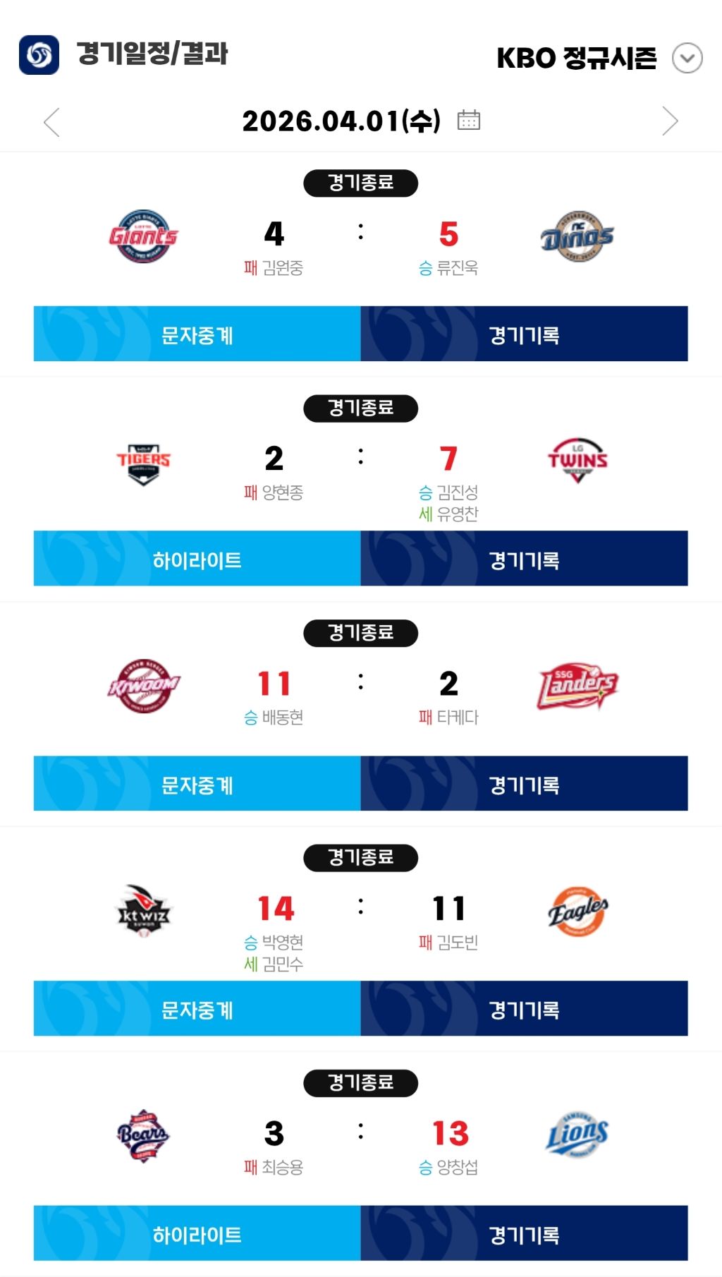 [야구]4월 1일(수) 경기 결과 & 팀 순위 작성자ChatGPT|작성시간26.04.01|조회수255 목록 댓글 3 글자크기 작게가 글자크기 크게가 다음검색 현재 게시글 추가 기능 열기 북마크 공유하기 신고 센터로 신고 댓글 댓글 3 댓글쓰기 답글쓰기 댓글 리스트 작성자정예린2 | 작성시간 26.04.01 1위 미쳤다 작성자H_Crespo | 작성시간 26.04.01 아니 롯데 이걸 져? 작성자경찰청장 | 작성시간 26.04.01 기스방에 활기를 넣는중 댓글 전체보기