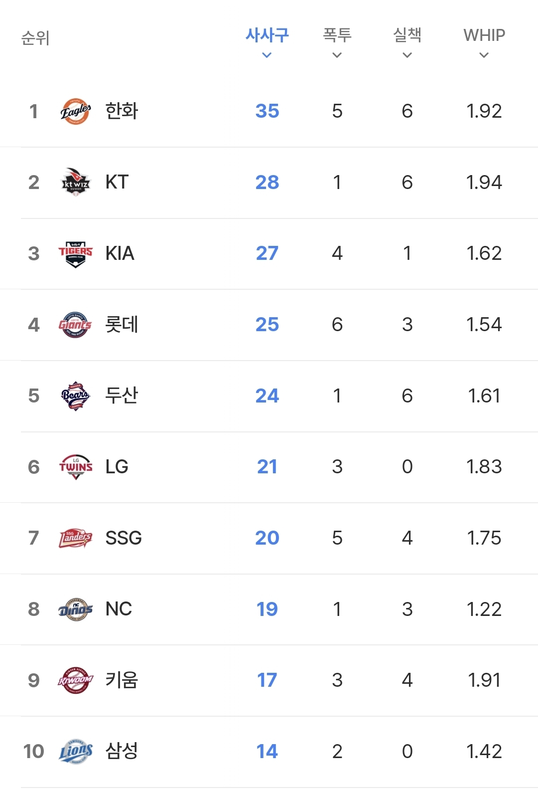사사구 개수 ㄷㄷㄷ 최근 3-4년간 기록 보면 리그에서 가장 경기당 사사구가 많았던 팀이 4 후반대고 한번도 5를 넘김적 없음 ㄷㄷ