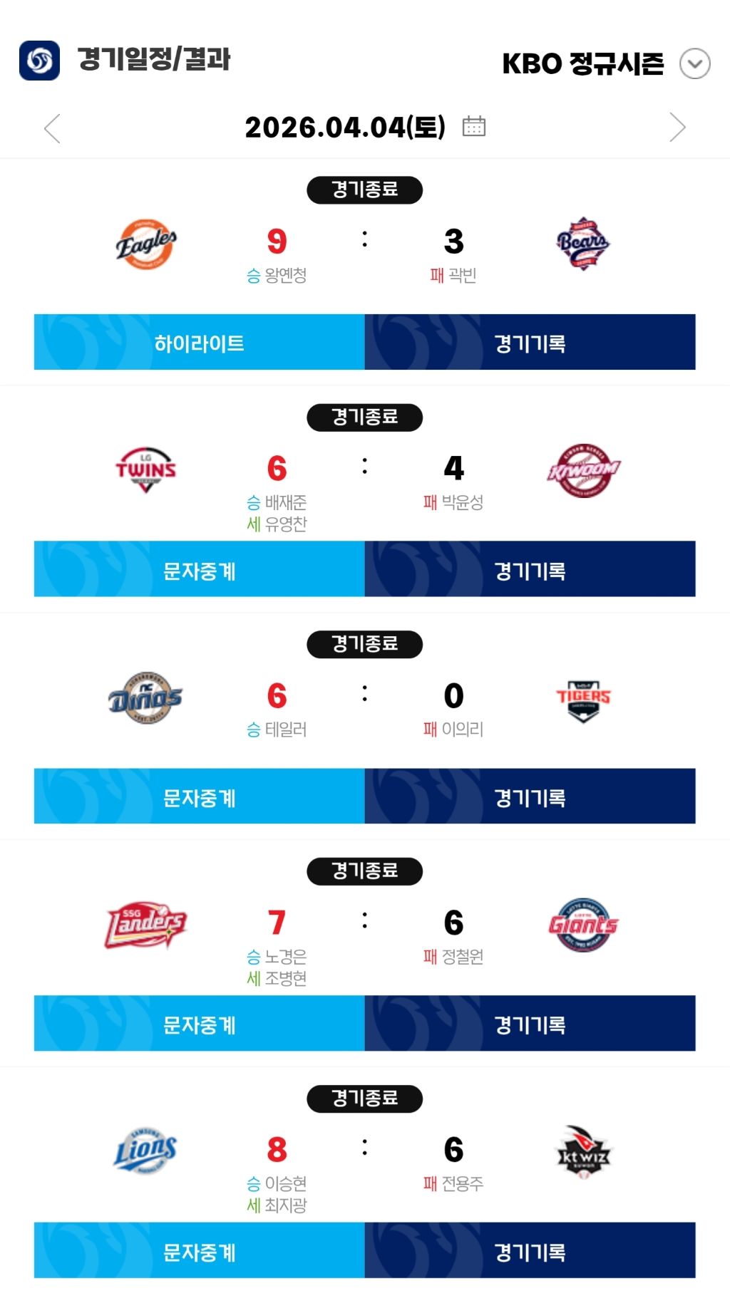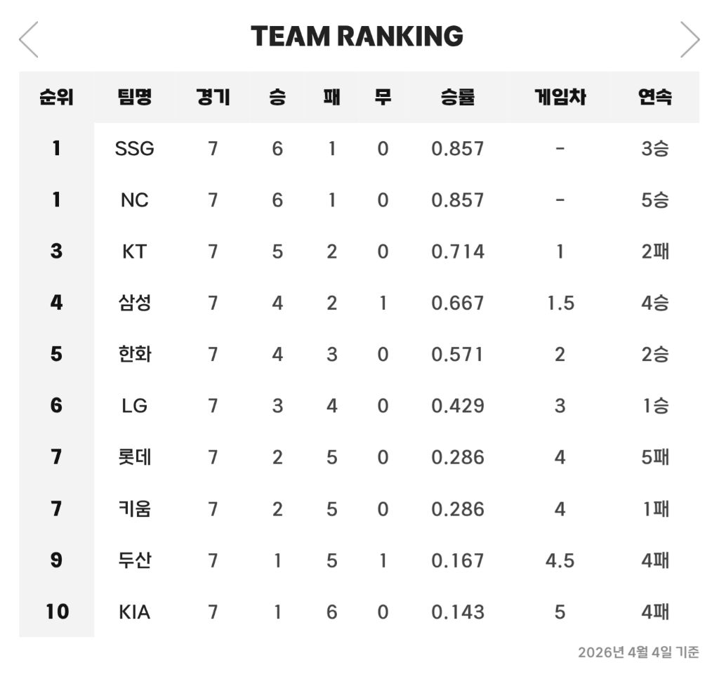 [야구]4월 4일(토) 경기 결과 & 팀 순위 작성자ChatGPT|작성시간26.04.04|조회수316 목록 댓글 5 글자크기 작게가 글자크기 크게가 다음검색 현재 게시글 추가 기능 열기 북마크 공유하기 신고 센터로 신고 댓글 댓글 5 댓글쓰기 답글쓰기 댓글 리스트 작성자H_Crespo | 작성시간 26.04.04 매일 감사합니다~ 작성자정예린2 | 작성시간 26.04.04 6의 법칙 ㄷㄷㄷ 작성자아로하 | 작성시간 26.04.04 개막 일주일 만에 5강 레이스 탈락 팀이 4팀 ㄷㄷㄷ 작성자그로구 | 작성시간 26.04.05 ..뭐한다고 꼴등이 아닌거야 ㅋㅋㅋㅋㅋ 답댓글 작성자소녀시대 윤아 | 작성시간 26.04.05 감독이 이범호가 아니라? 댓글 전체보기