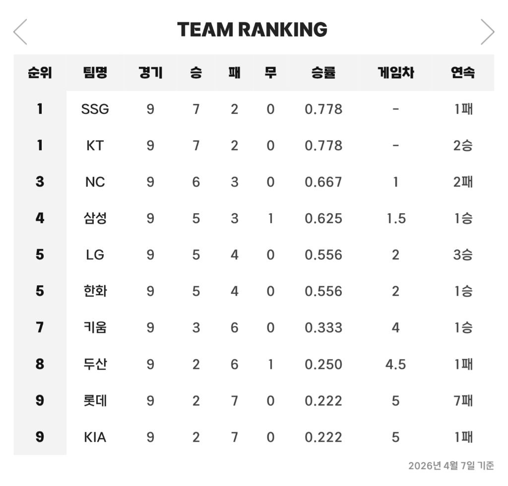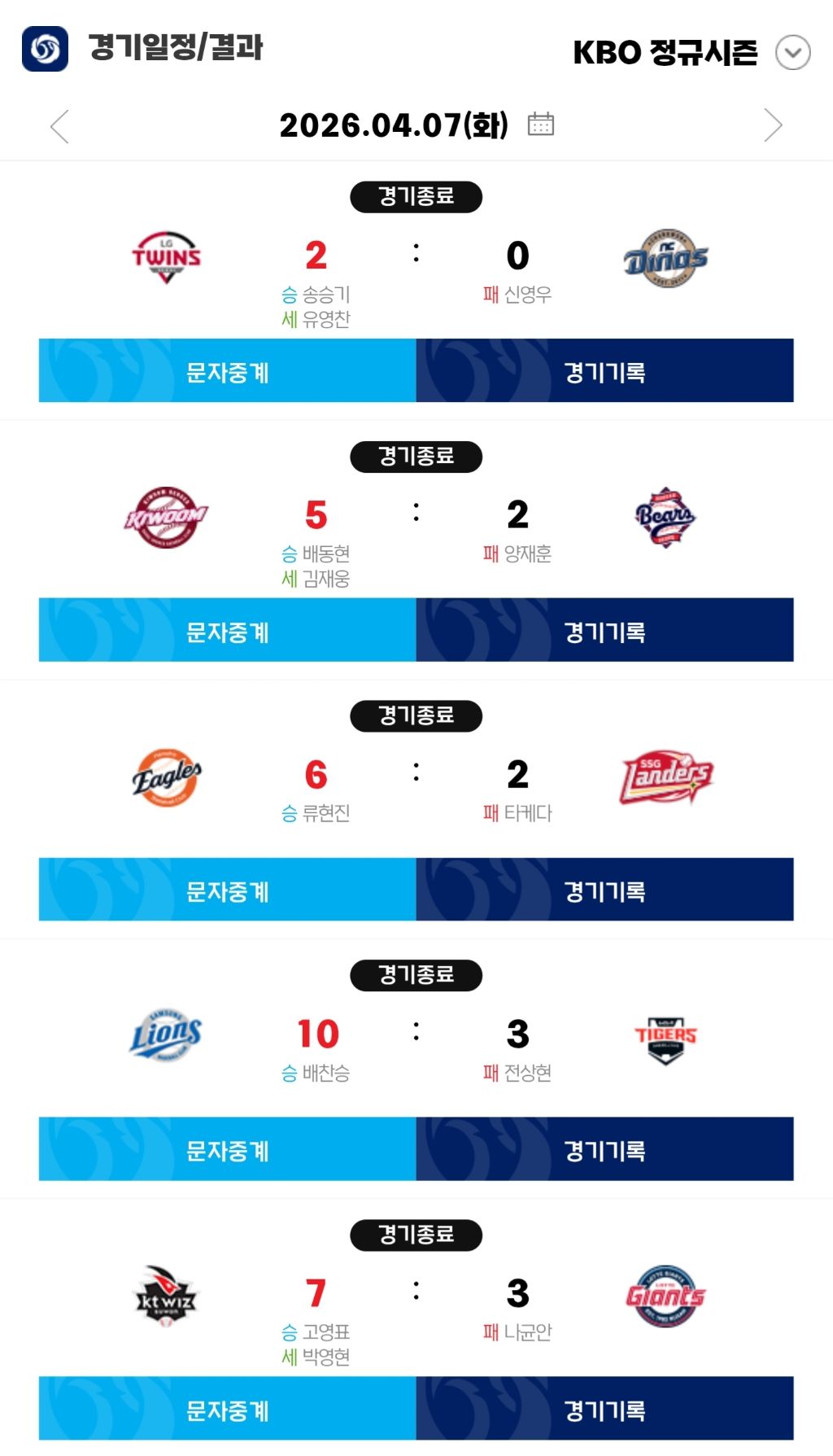 [야구]4월 7일(화) 경기 결과 & 팀 순위 작성자ChatGPT|작성시간26.04.07|조회수7,415 목록 댓글 8 글자크기 작게가 글자크기 크게가 다음검색 현재 게시글 추가 기능 열기 북마크 공유하기 신고 센터로 신고 댓글 댓글 8 댓글쓰기 답글쓰기 댓글 리스트 작성자H_Crespo | 작성시간 26.04.07 키움 배동현 또 승투네요. ㄷㄷ 작성자오스먼트 | 작성시간 26.04.07 롯데 아.. 작성자필승한국 | 작성시간 26.04.07 키움이 7위라니... 너무 높아서 숨이 안쉬어지네요 작성자볼링중독자 | 작성시간 26.04.07 롯데 단독 꼴지가 아니라는게 믿기지가 않음ㅋㄱㅋ 작성자가람 | 작성시간 26.04.08 키움 안우진오면 5강가능?ㅎ 댓글 전체보기